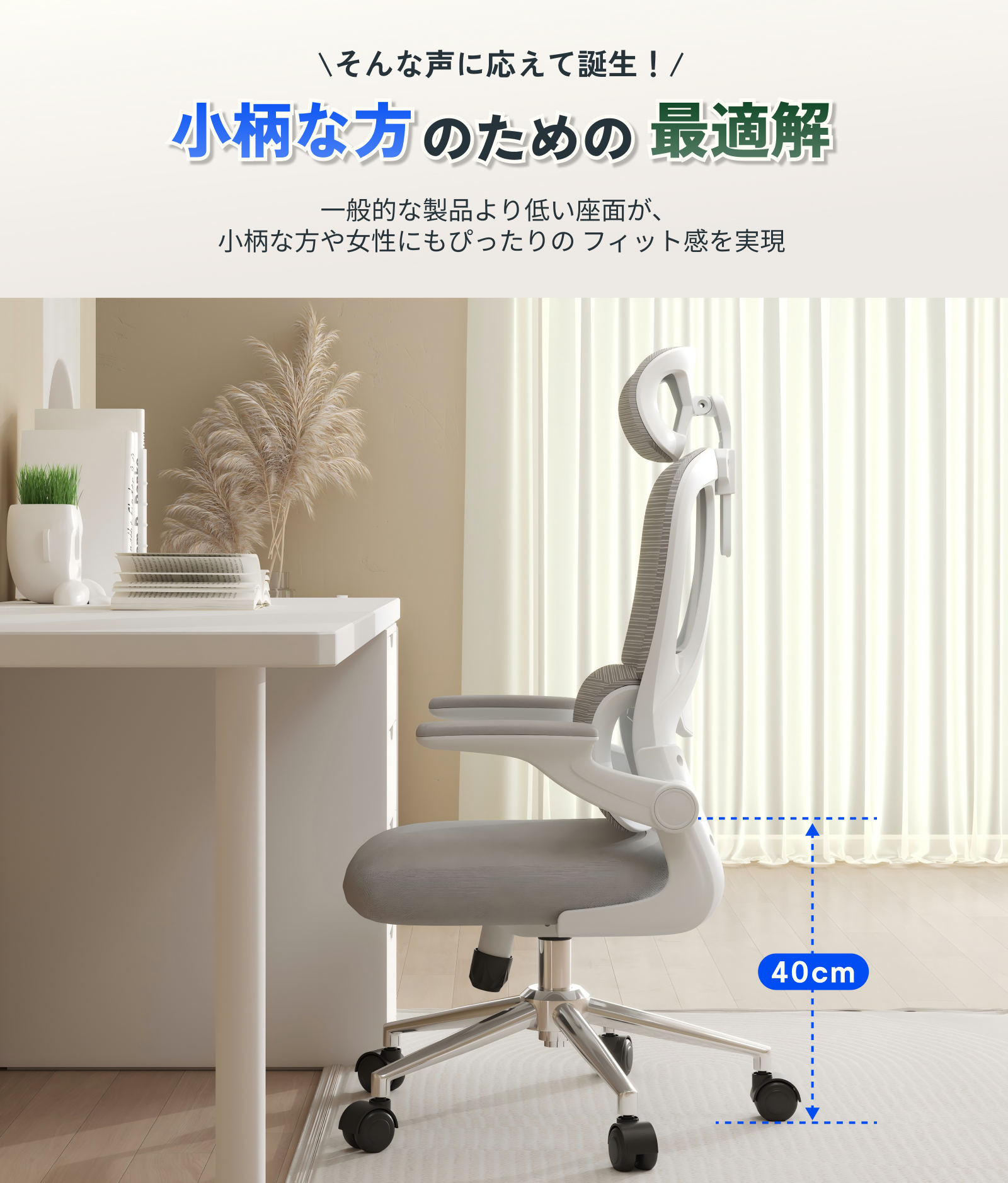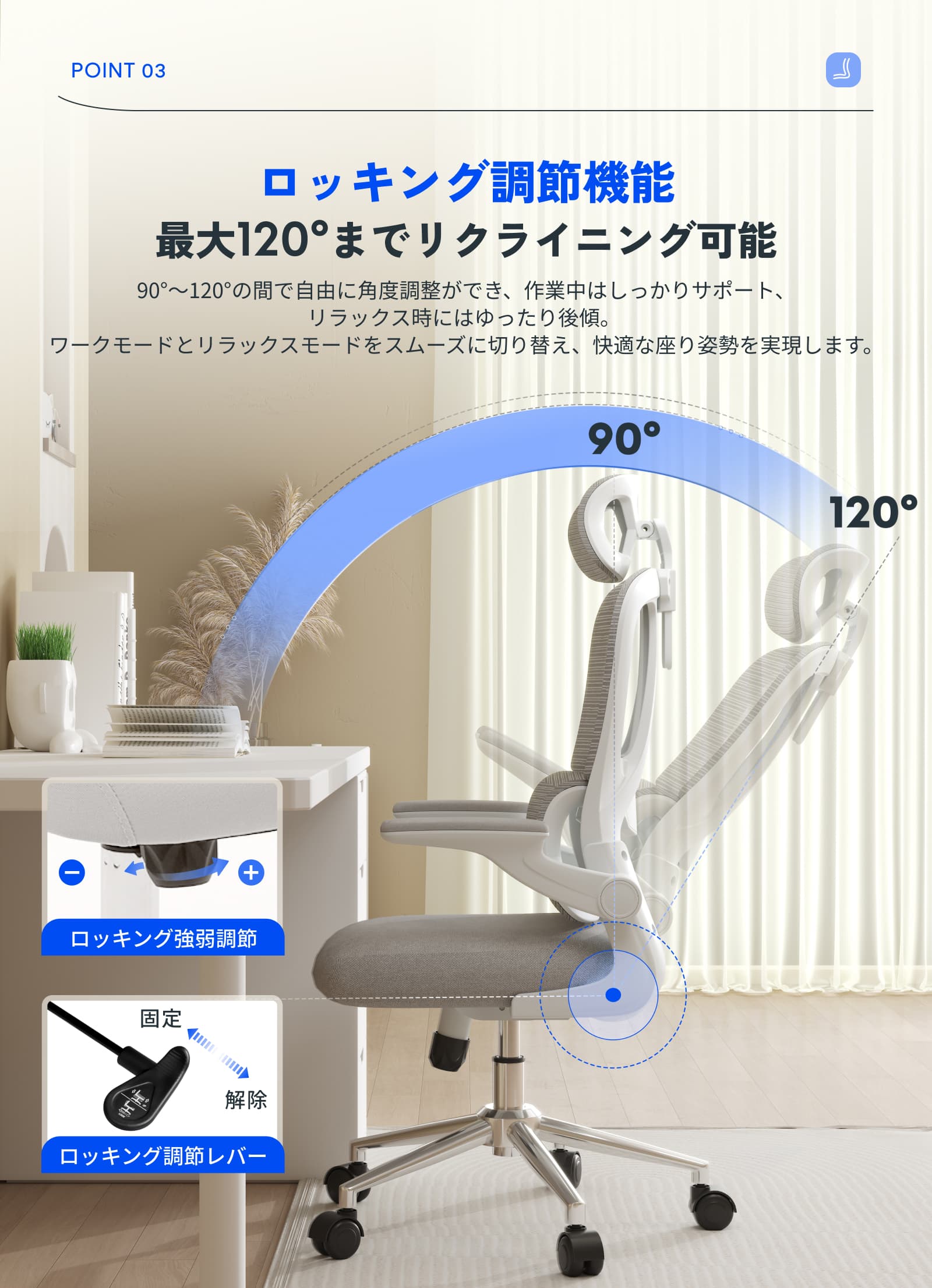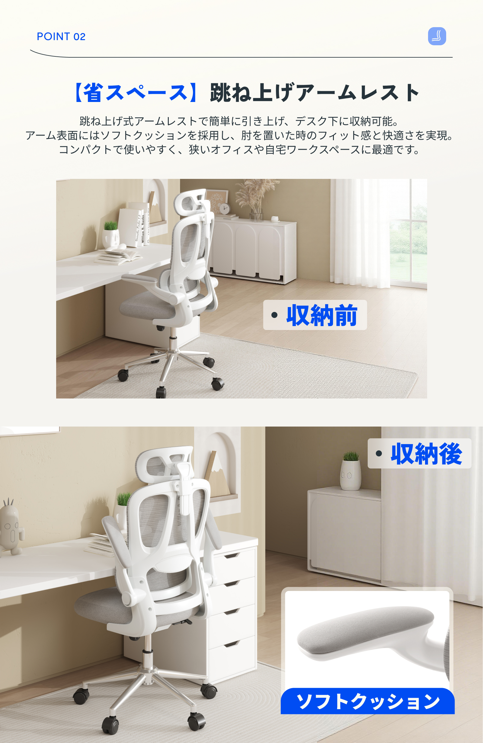 ・跳ね上げ式アームレスト:簡単に引き上げてデスク下に収納可能。スペースを効率的に使える設計で、狭いオフィスや自宅に最適。