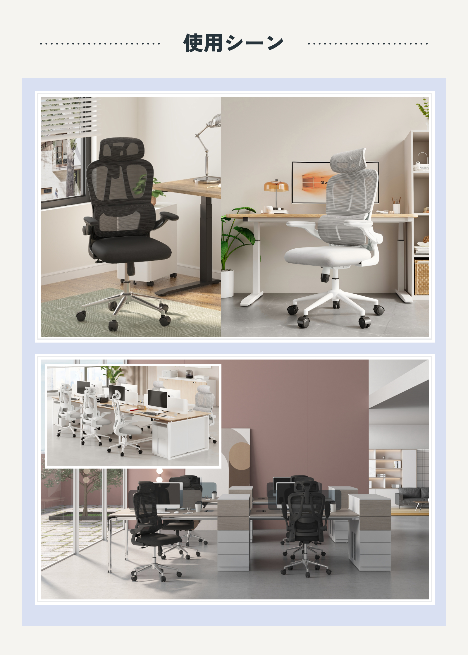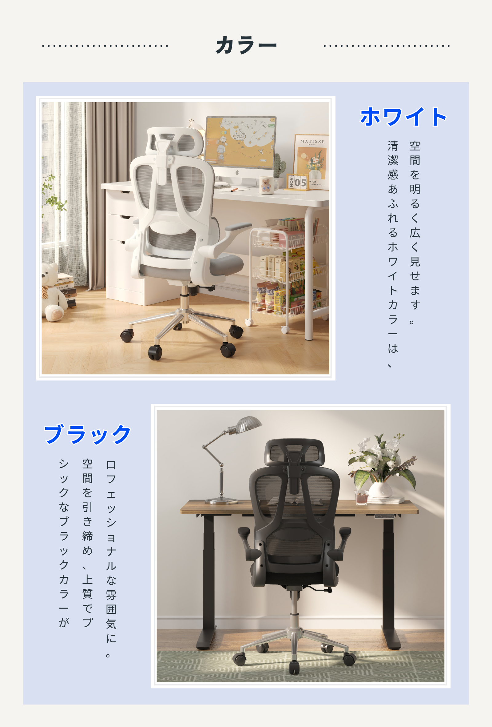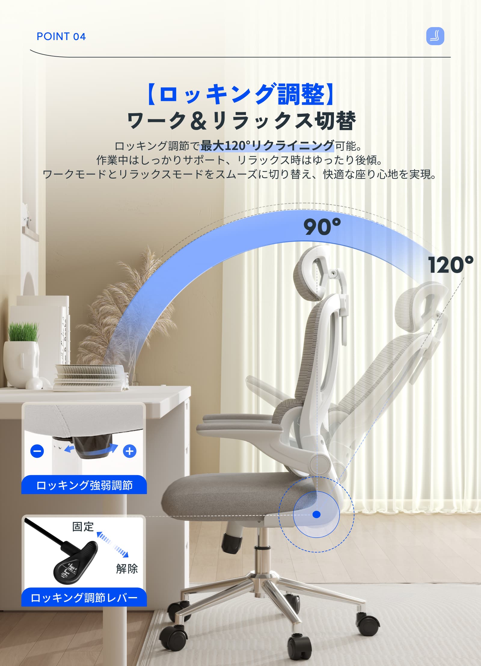 ・跳ね上げ式アームレスト:簡単に引き上げてデスク下に収納可能。スペースを効率的に使える設計で、狭いオフィスや自宅に最適。