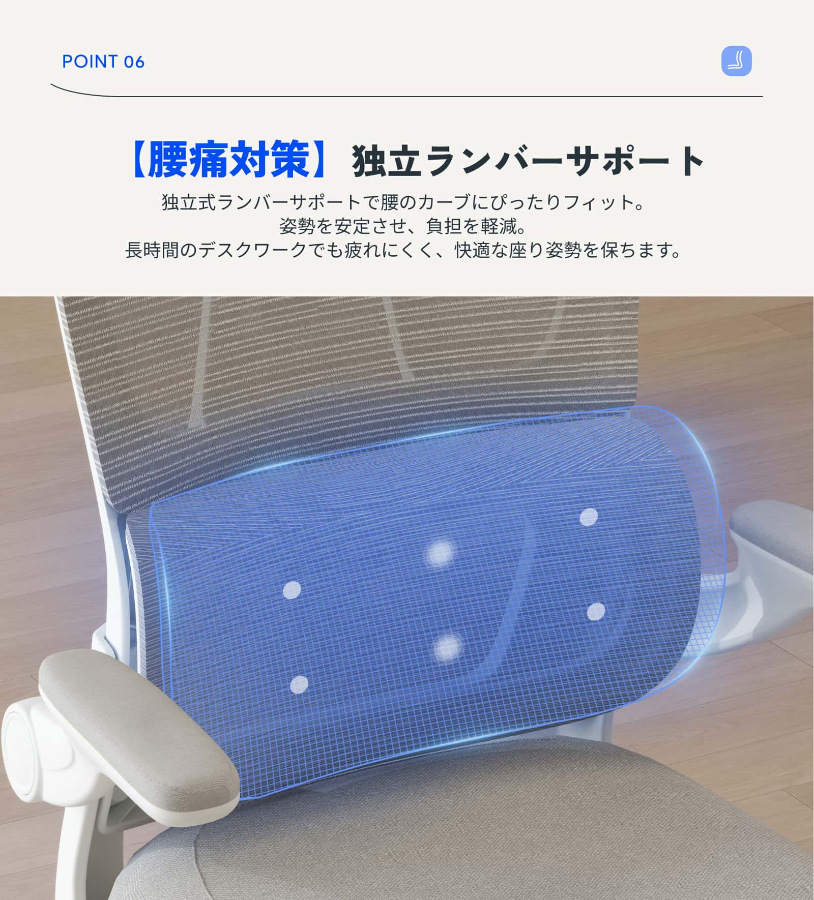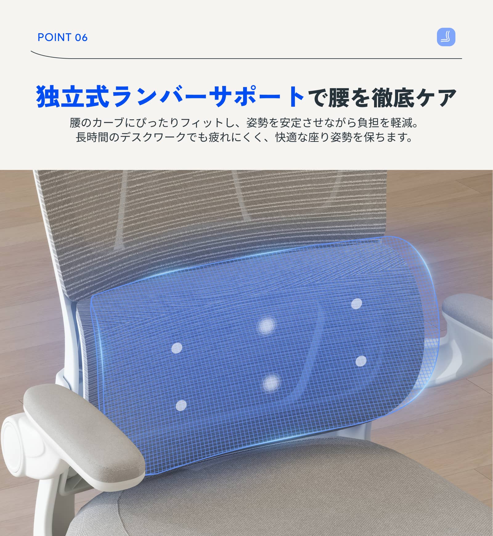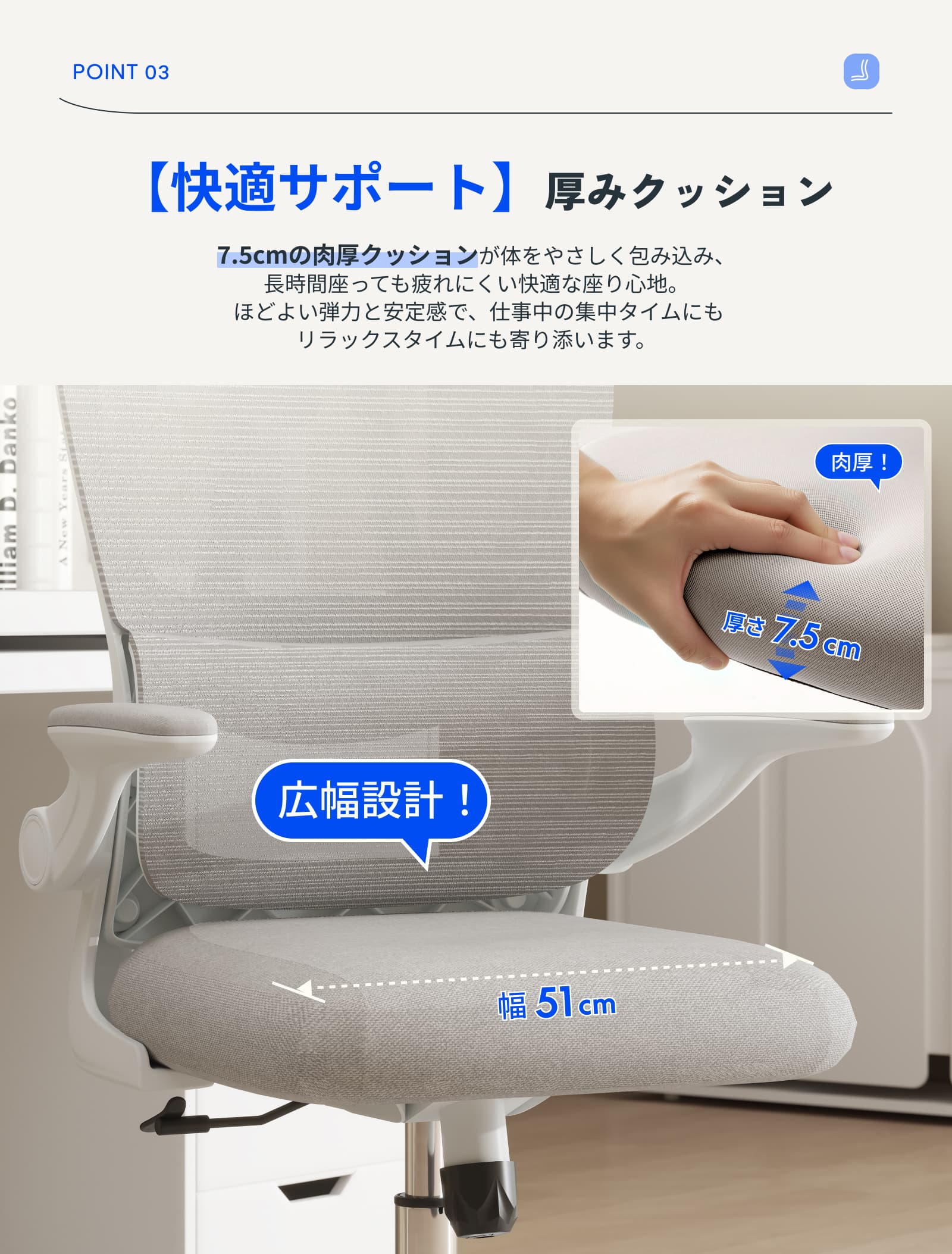 ・7.5cm肉厚座面:厚みのあるクッションが体をやさしく包み込み、長時間座っても疲れにくい快適な座り心地。ほどよい弾力と安定感で、集中作業もリラックスタイムも心地よくサポートします。