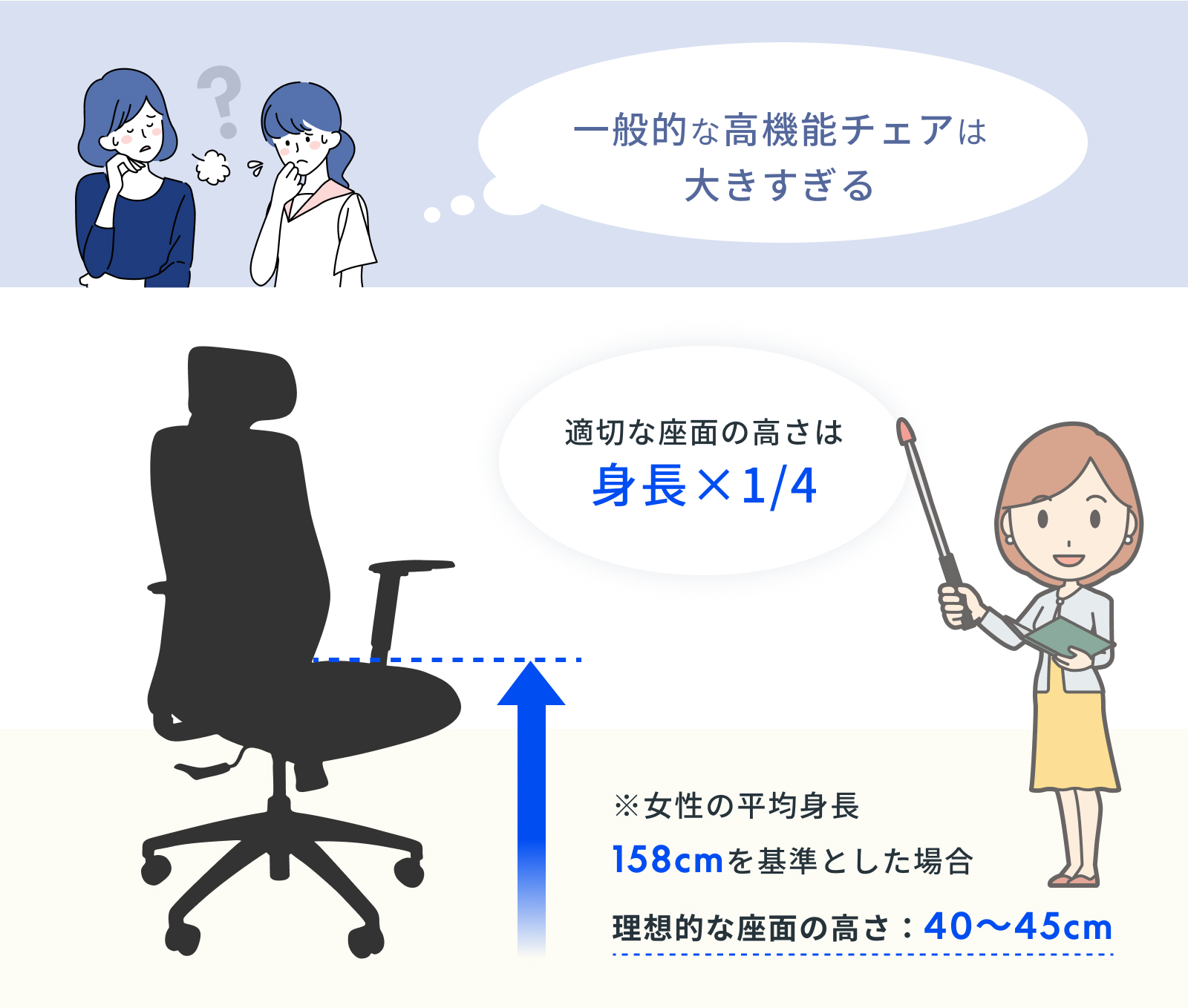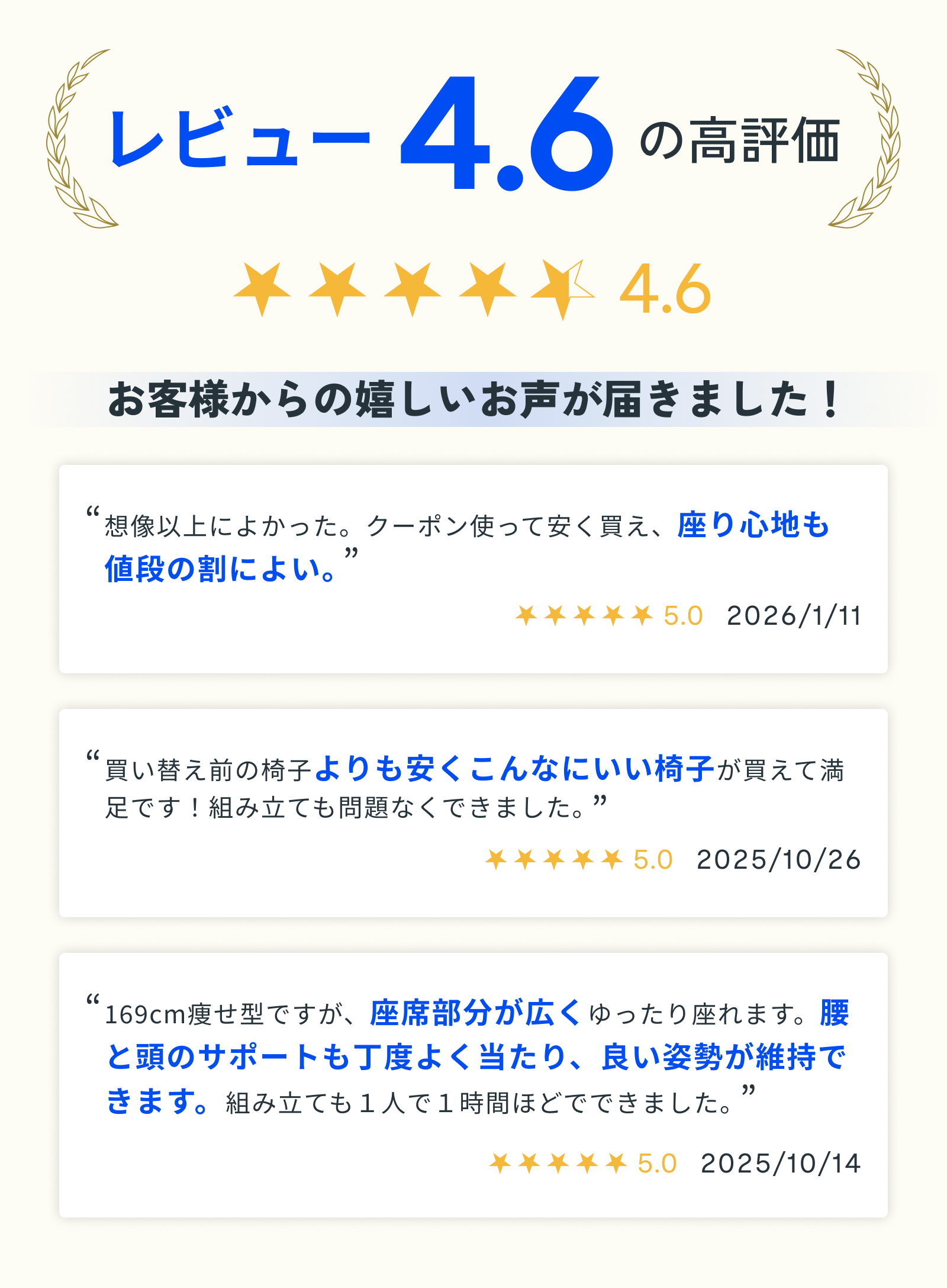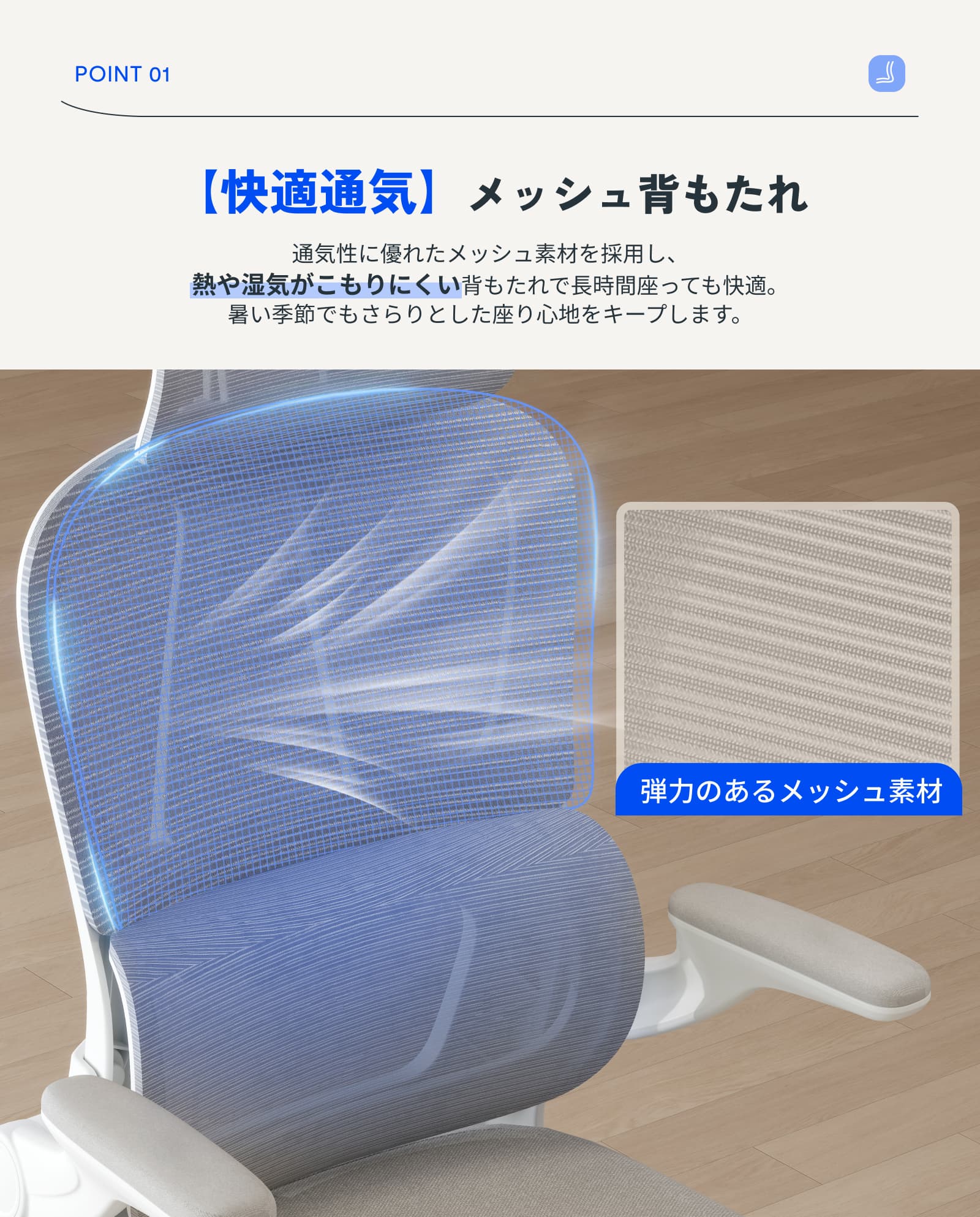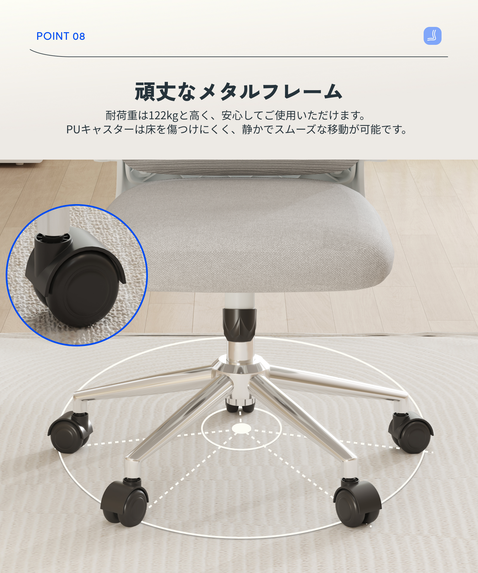 ・7.5cm肉厚座面:厚みのあるクッションが体をやさしく包み込み、長時間座っても疲れにくい快適な座り心地。ほどよい弾力と安定感で、集中作業もリラックスタイムも心地よくサポートします。