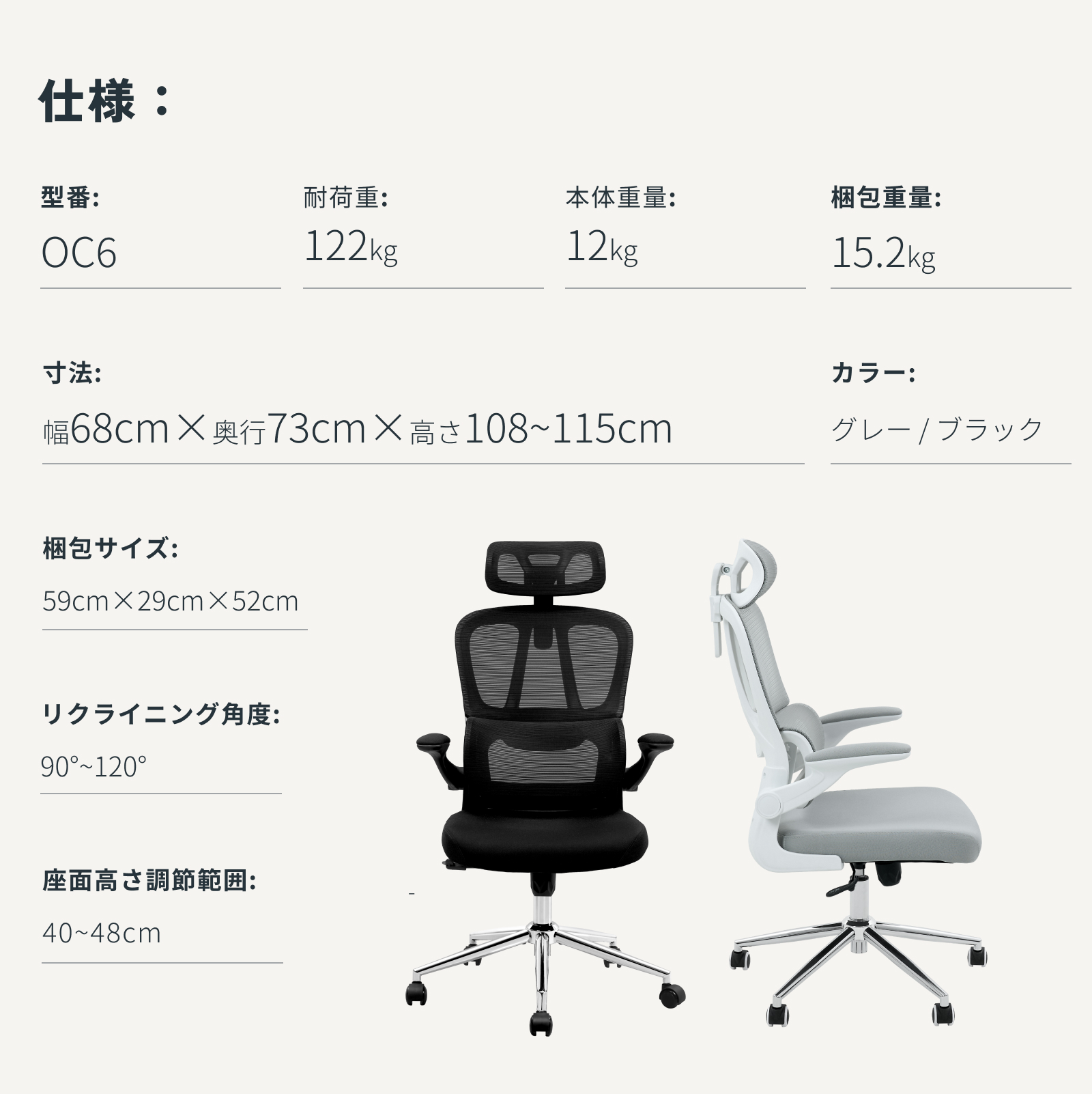 ・多機能:120°リクライニング、ランバーサポート、跳ね上げ式アームレスト、2Dヘッドレスト