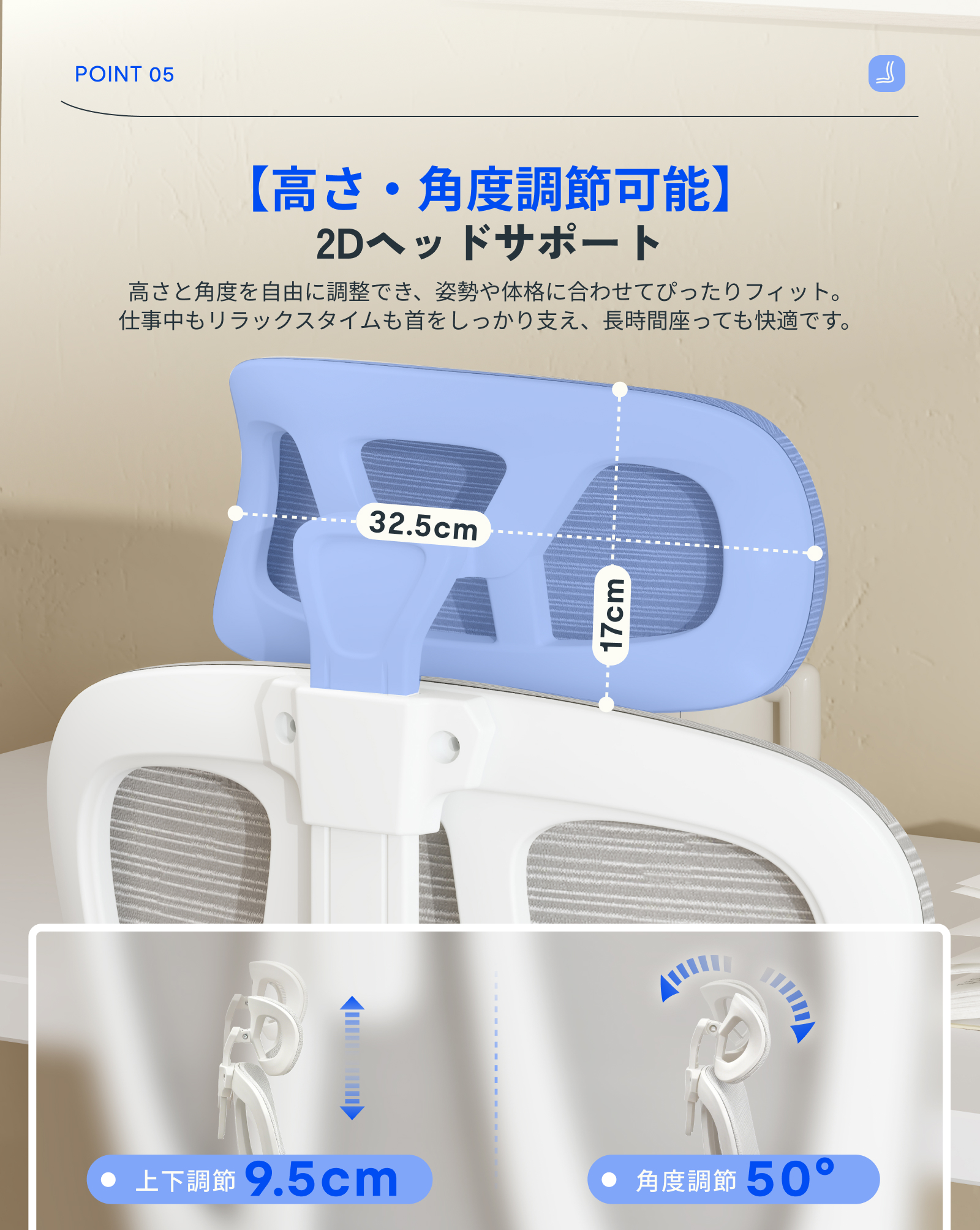 ・2Dヘッドレスト:高さと角度の調整が可能で、姿勢や体格に合わせて細かくフィット。作業中でもリラックスタイムでも首元をしっかり支えるので長時間でも快適に座り続けられます。