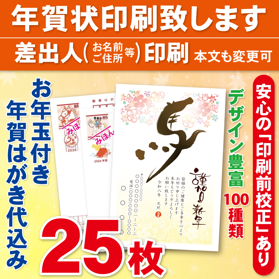 お年玉付き年賀はがき25枚(官製ハガキ) 年賀状印刷致します 差出人印刷 25枚3950円