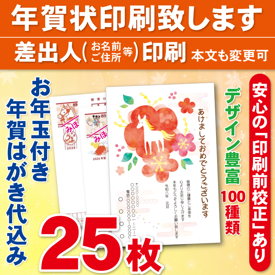 お年玉付き年賀はがき25枚(官製ハガキ) 年賀状印刷致します 差出人印刷 25枚3950円