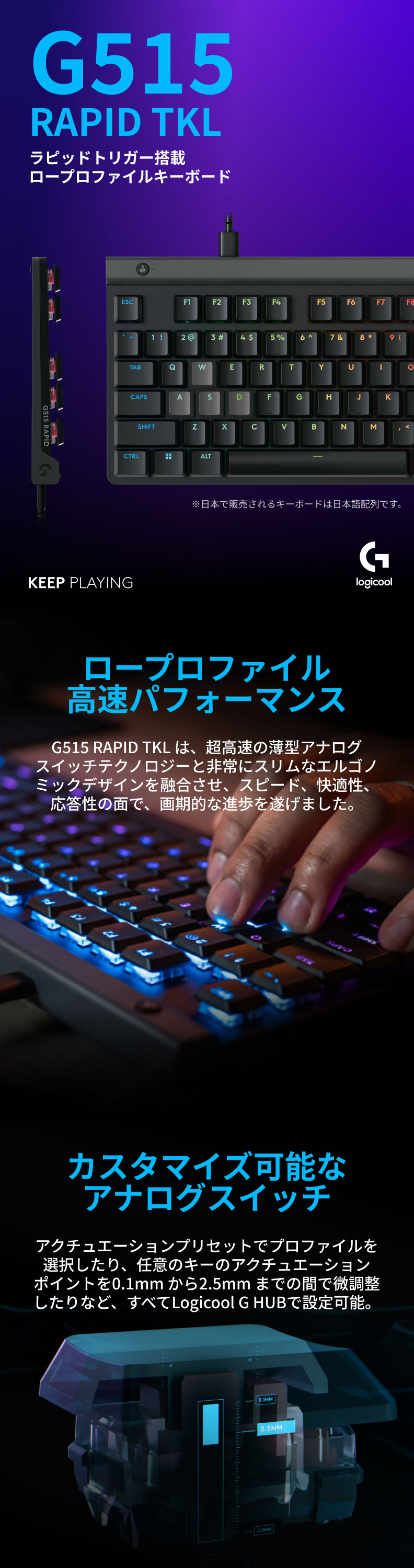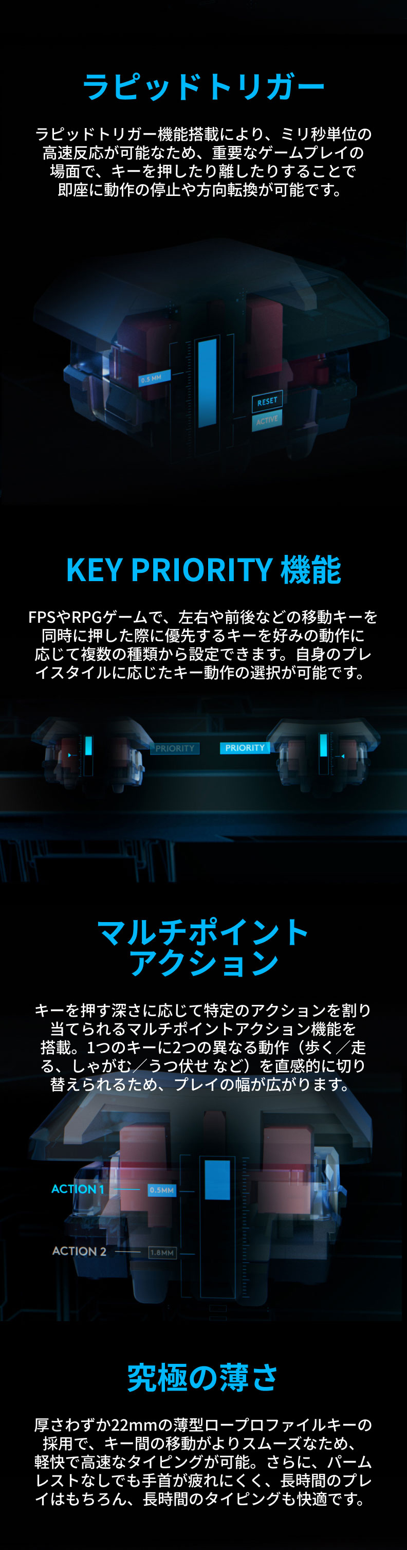 また、キーを押す深さに応じて特定のアクションを割り当てられるマルチポイントアクション機能を搭載。1つのキーで2つの動作を直感的に切り替えられるため、素早さが求められるゲームでもプレイの幅が広がります。