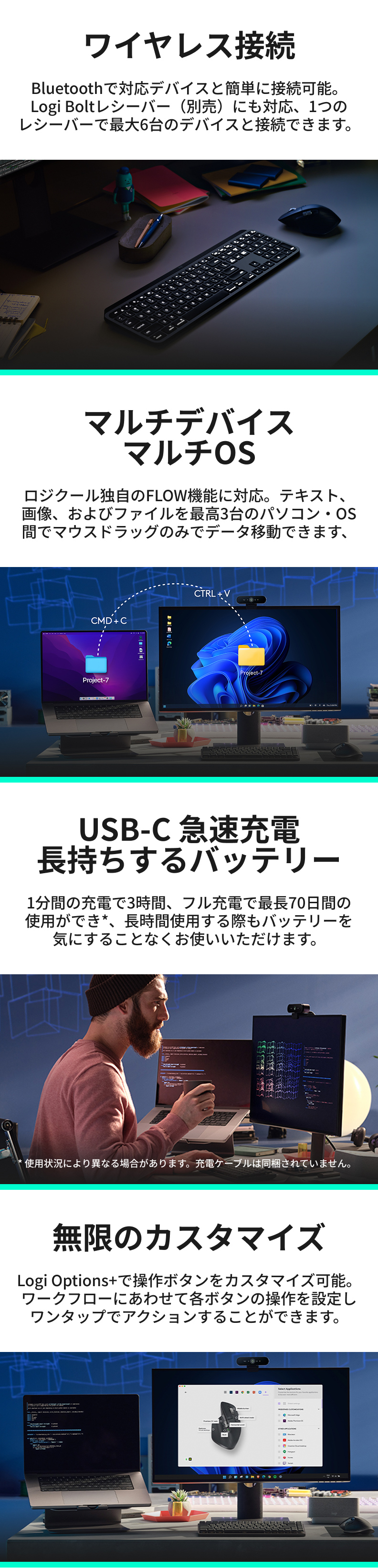 トラッキングセンサーは8,000DPIで、ガラス面を含むあらゆる面を精確にトラッキングし、高精度のモニターにも対応しています。また、マウスの底面には広い面積のソールを採用し、より滑らかで安定した操作を実現します。また、自宅やオフィスなどあらゆる作業環境においてもクリック音が気にならず、集中力、効率性を高めます。スイスのLogitech International本社内にある「LOGI エルゴ・ラボ」にて設計・開発された自然な傾斜角とボタン配置により、長時間の使用でも疲労感を軽減します。