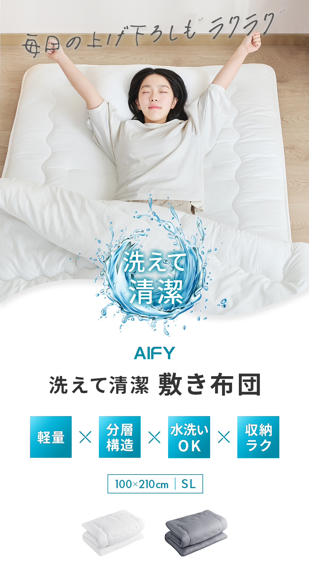 敷布団 シングル 敷き布団 ボリューム 10cm厚 洗える 厚め 防ダニ 抗菌 敷ふとん 式布団 へたりにくい 敷きふとん 100×210 AIFY アイフィ