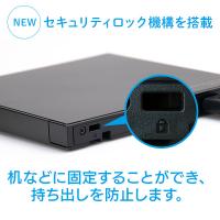 盗難防止のためのセキュリティロック機構としてケンジントンロックのスリットを製品背面に設置しています。机などにドライブを固定することができるので、外出先での利用時やドライブを共有する際などでの盗難を防止します。
