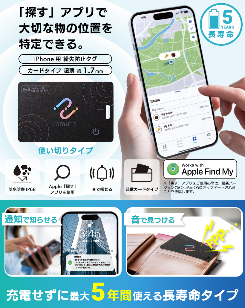 充電や電池交換がいらない使い切りタイプ。長寿命設計で、財布やパスケースなどに入れたままの状態で最大5年間使うことができます。