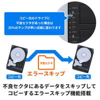 データの読み込みも書き込みも不能になる不良セクタがあるドライブも、エラー箇所を強制的にスキップしてコピーすることができます。また、コピー元に不良セクタがある場合、LEDが高速点滅し、一目で確認できるようになっています。