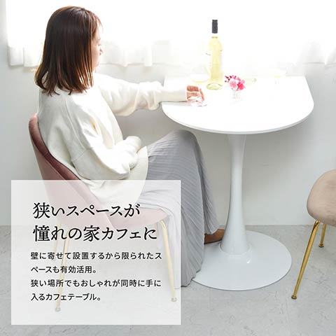 限られたスペースを有効活用できる半円型のコーヒーテーブル、直径60cm。一辺を直線に仕上げているので壁面にぴったり設置でき、限られたスペースを有効活用。丸みのあるテーブルで二人がお茶を楽しめるサイズ。グリーンを置いたりドレッサーとして使ったりと用途は様々です。