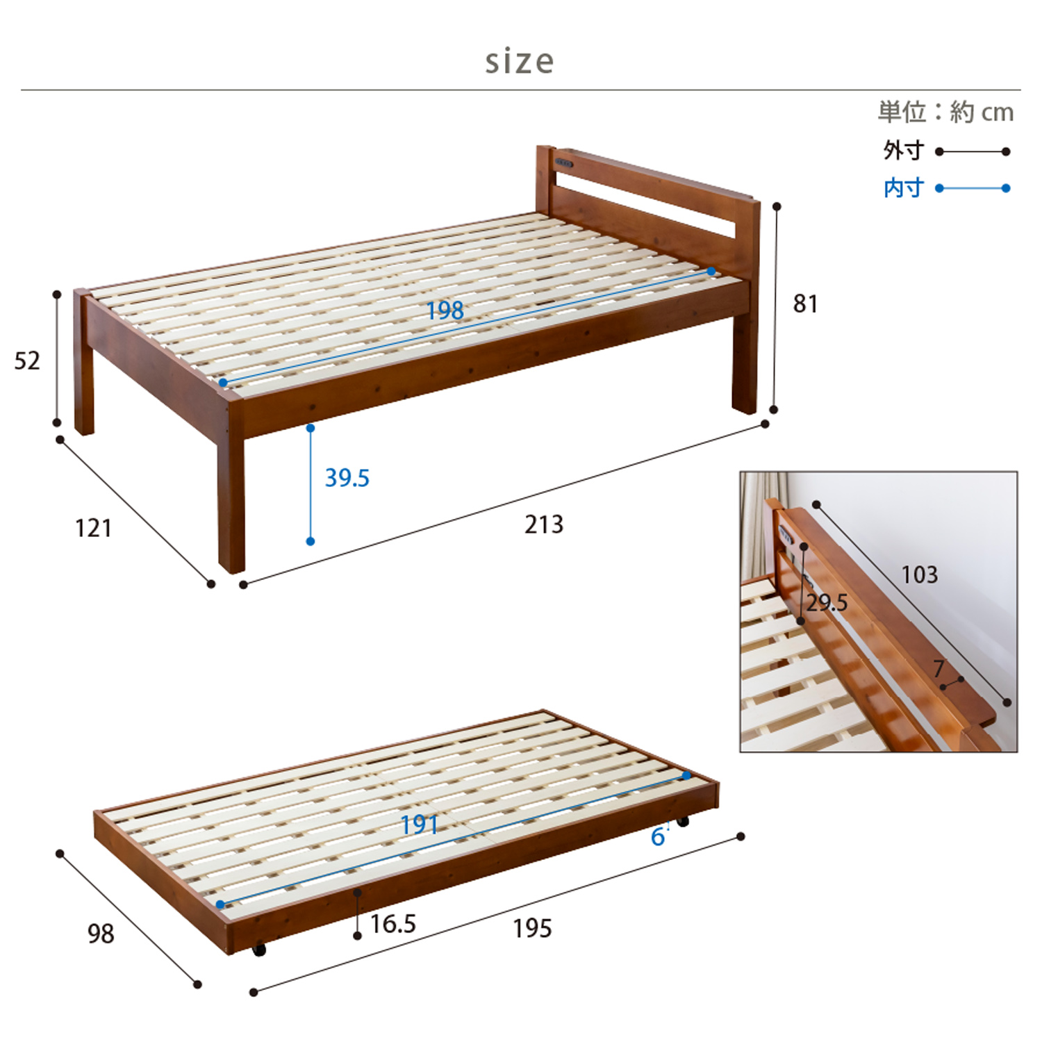 | その他 | ■小物類は撮影用のイメージです。 ■写真の色調は実際の商品と多少異なって見える場合がございます。予めご了承下さい。 ◆北海道・沖縄・離島への配送不可となります。 下段の子ベッドはキャスター付きなので、移動ができます。使わない時は上段親ベッドの下に収納できます。 下段ベッドはお子様との添い寝、来客用、または収納スペースとしても活用できます。 子ベッドのキャスターにはストッパーが付いているので、不用意な動きを止められます。 上下段とも床板は「すのこ」仕様なので、通気性に優れています。 |