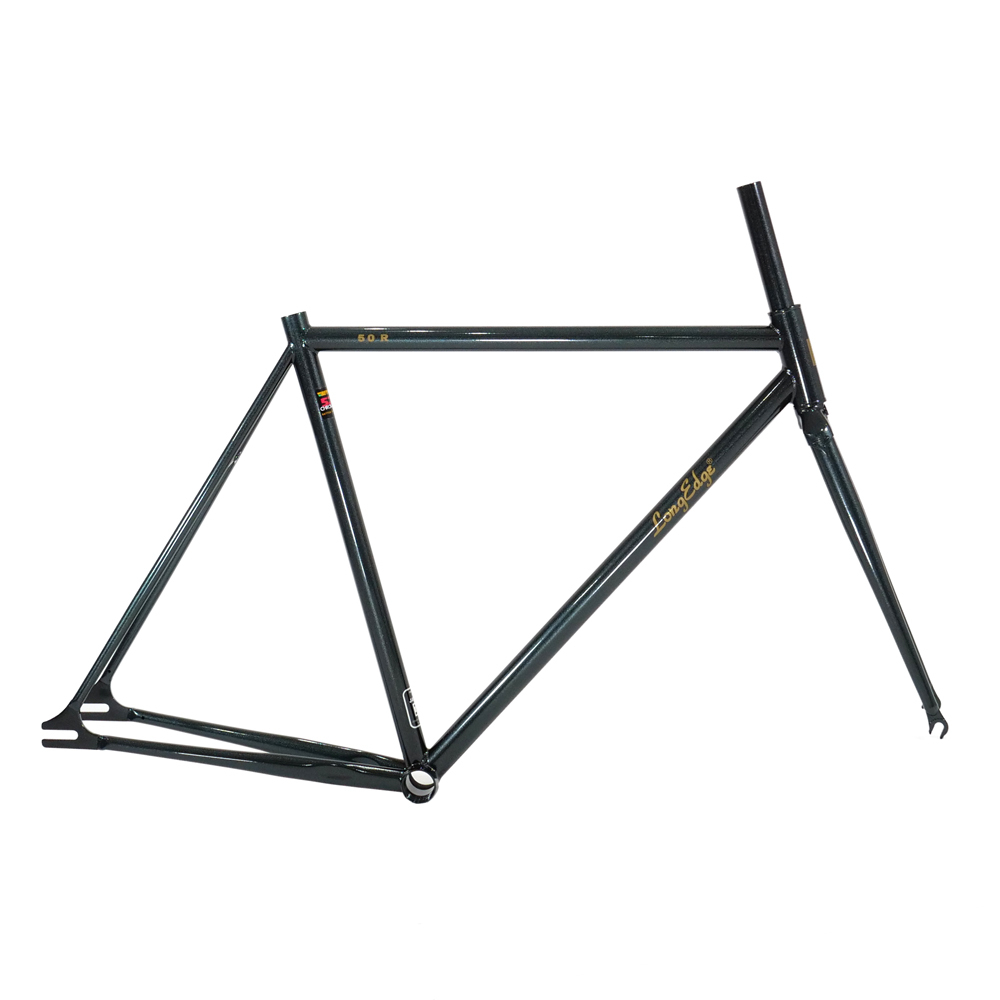 LongEdgeのフラッグシップモデルLE-50Cの後継機”LE-50R”。今作からパイプをReynoldsチューブにフルモデルチェンジ。更にフロントフォークもクロモリに変更した事で、よりシャープなフォルムと粘りのある乗り心地となっております。塗装はラメ入りガンメタリックでゴールドのロゴとの相性もgood。