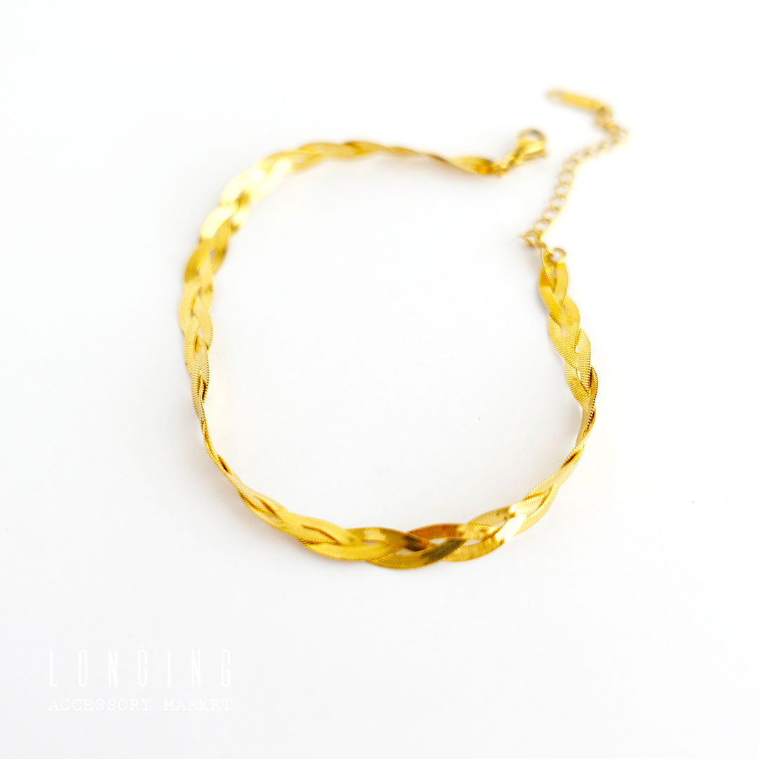 美しく編み込まれたチェーンが特徴のゴールドアンクレット。