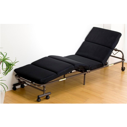 | 14段階リクライニング機能付き! 背、脚のリクライニングは連動式なのでフィット感も抜群な折りたたみベッドです。 モコモコのクッションマットが体圧を分散し、快適な寝心地です。 折りたたみ時は旅行用のスーツケース程度の大きさなのでコンパクトに収納できます。 また、取っ手が付いているのでスーツケースのように転がして移動することが可能です。 病院の付き添いや、急な来客用、アウトドア用と幅広いシーンで活躍します。 | |