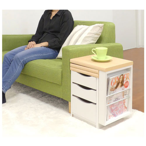 天板を折りたためば幅34cmと場所をとらず、必要なときに広げるだけで机になります。 小物整理に便利な引出しは、両面から使える仕様です。 大人から子どもまでお使いいただけるシンプルデザイン&カラー、和室・洋室を問わず色々な使い方ができます。