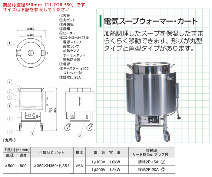 | 商品名 | 電気スープウォーマーカート 丸型 単相100V/1.0kW 単相200V/1.5kW |
