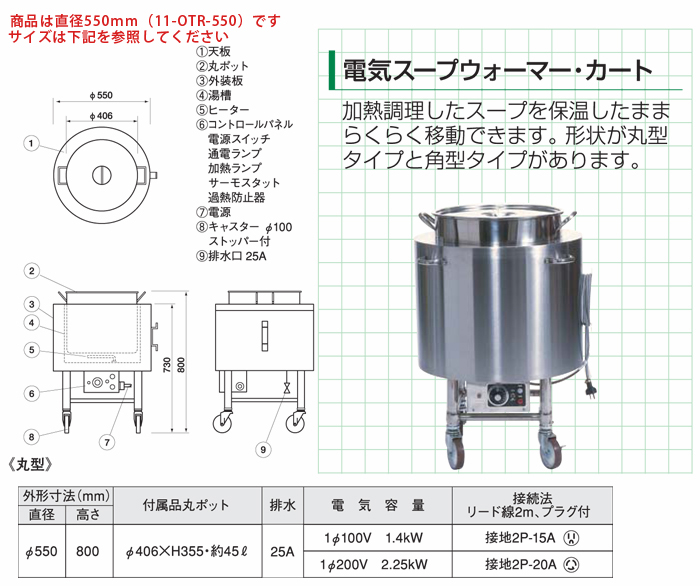 | 商品名 | 電気スープウォーマーカート 丸型 単相100V/1.4kW 単相200V/2.25kW |