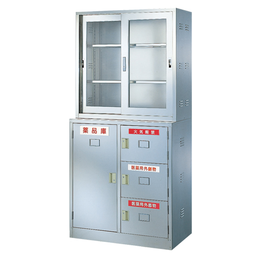 | 劇物、毒物、一般薬品の安全管理・確実保管・盗難防止に最適! 通気性の良いエアホール加工を施したサビに強いステンレス製です。 上段と下段の左室は上下可動式の棚板が2枚付いています。 鍵(シリンダー錠)付きですのでセキュリティー面も安心です。 ステッカーはお好みの位置に張り付けることができます。 |