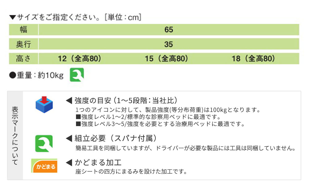 | 高田ベッド製作所 TAKADABED ゴムシート 山形ゴムシート 安全 補助 組立式 幅65cm 奥行35cm 高さ12cm 高さ15cm 高さ18cm 全高80cm 介護用 大学病院 検診 健康診断 診療所 市役所 役場 ホテル 旅館 宿泊施設 商業施設 接骨院 整体 デイサービス | |