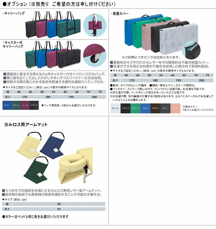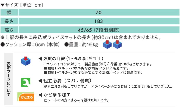| 診察台、マッサージベッドとしてスポーツシーンや医療施設で活躍! 省スペース&実用性の幅70cmを標準設定した木製ポータブルベッド。 6cmの高反発・高密度ウレタンを採用。差込式フェイスマット付き。 安全性と強度を優先したダブルノブネジ式7段階式高さ調節機能付き。 |