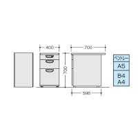 | サイズ | 外寸:幅400×奥行700×高さ700mm 引き出し上段内寸:幅317×奥行430×高さ92mm 引き出し中段内寸:幅317×奥行430×高さ180mm 引き出し下段内寸:幅317×奥行540×高さ302mm 重量:27kg |