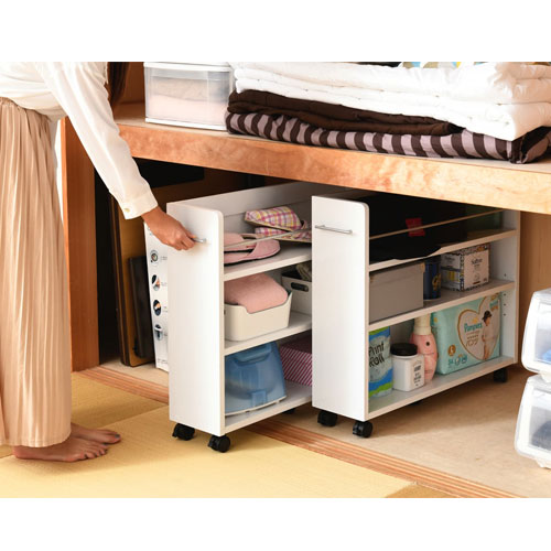 | キャスター付きの便利な押入れラック2個組。 取っ手はどちらにも取り付け可能なので、収納箇所の向きは左右入れ替えできます。 本やメディア類や、日用品のストックまで、押入れ内のスペースを有効活用するのでお部屋をすっきり片付けられます。 |
