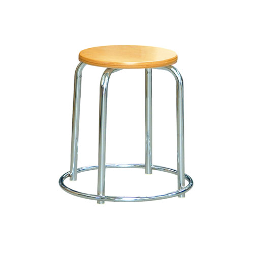 | 様々なシーンで活躍するラウンドスツールです。 座面はブナ合板、脚部はスチールパイプです。 低い位置の外側にリングのついたタイプです。 |