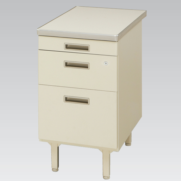 | スチール製のシンプルな脇机です! 鍵を閉めると全段ロックされるオールロック式です。 |