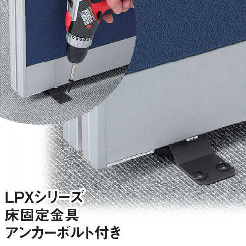 | 特記事項 | ※床固定金具のみでは自立しません。直線レイアウトで自立させる場合には安定脚をご使用下さい。 ※ドアパネルには取付けできません。 ※OAフロアー等の二重底には効き目が期待できません。 ※配送時の注意事項がございます。 対応商品:LPXシリーズ |