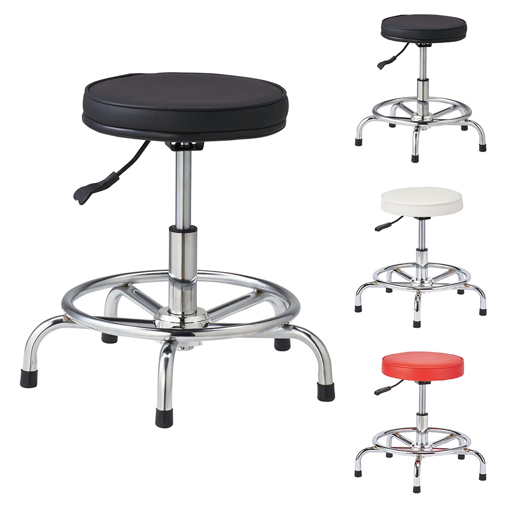 | 仕様 | 脚部:スチール+クロームメッキ 座部:ウレタンスポンジ+PVCレザーシート ●昇降機能付き |