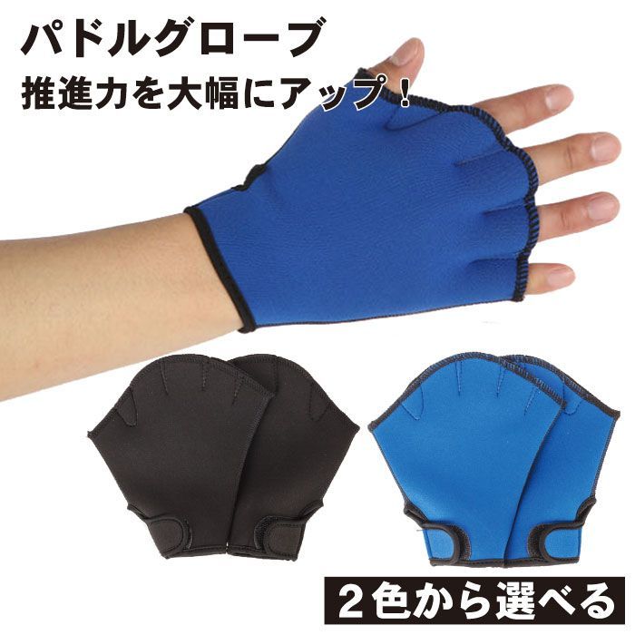 手が水かきになるパドルグローブです。 水泳、サーフィン、スイミング等に最適です。 推進力を大幅にアップ! 水かきがついているので 泳ぐのに楽になります。 適度な厚みでクッション性もありますので、手の保護にもなります。 挿入口には面ファスナーがついているので、着用が簡単です。 ジムなどでの水中歩行の補助にも! サイズ:Mサイズ 素材:ナイロン カラー:ブルー・ブラックからお選びいただけます。