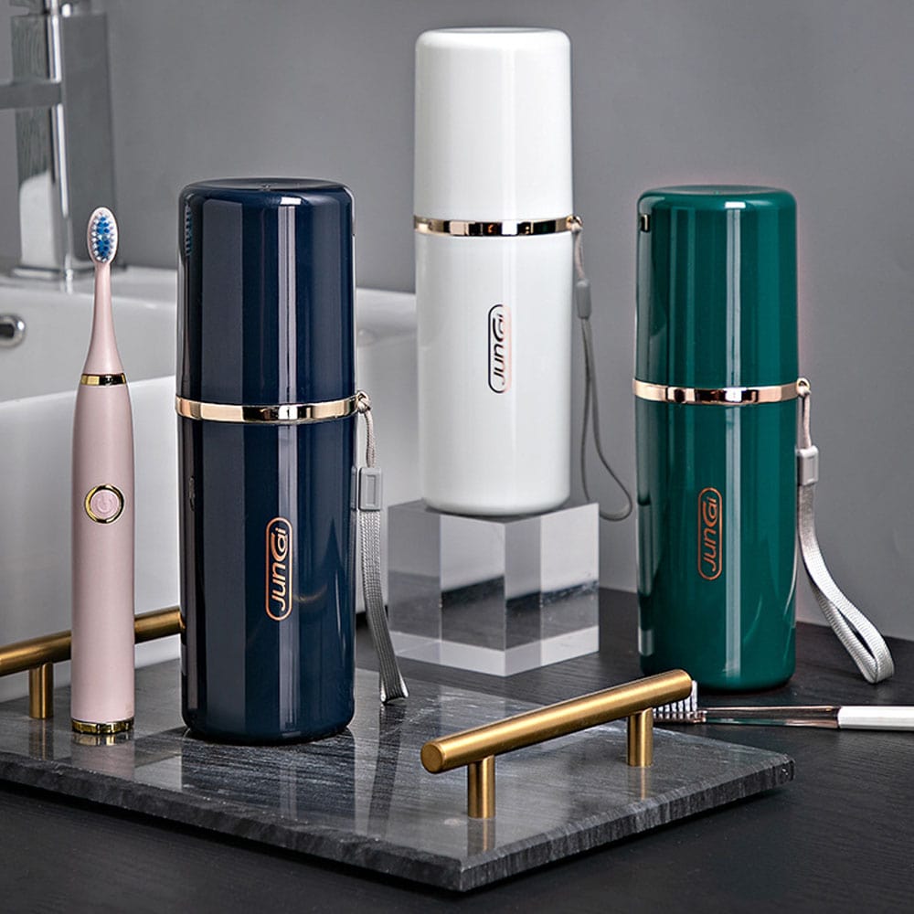 このコップ付き歯ブラシケースが、携帯用歯磨きセットをスマートに収納します。