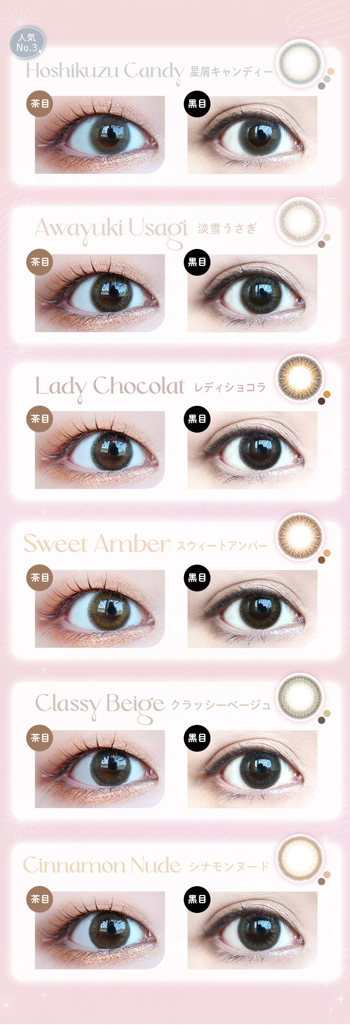 ■カラー:レディショコラ、スウィートアンバー、クラッシーベージュ、シナモンヌード、天使のなみだ、淡雪うさぎ、満月パンケーキ、星屑キャンディー、夢見パール、海月リング