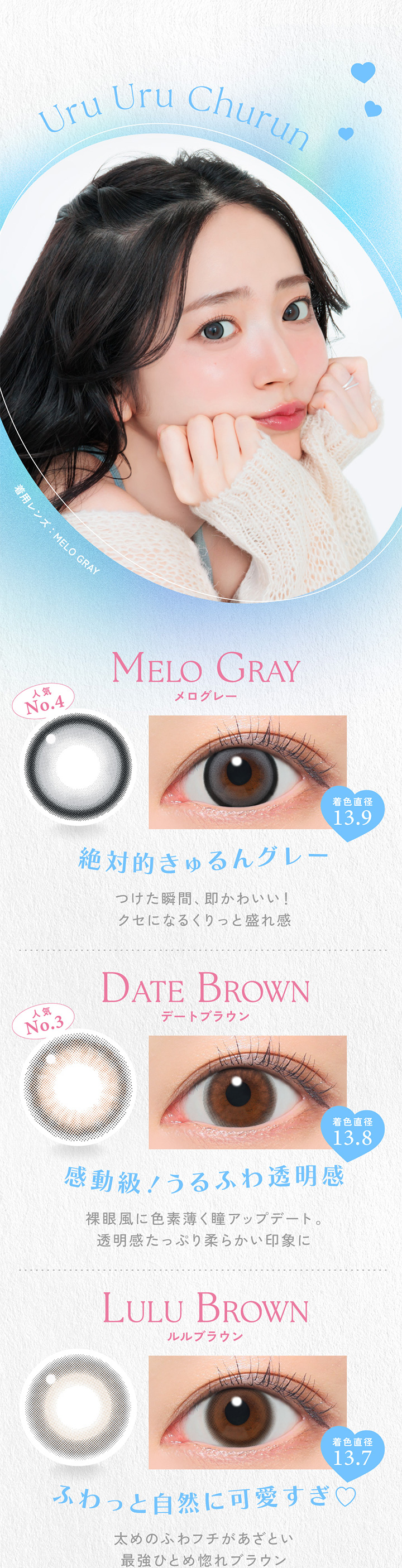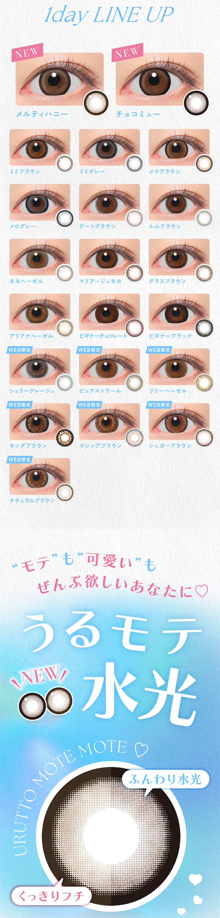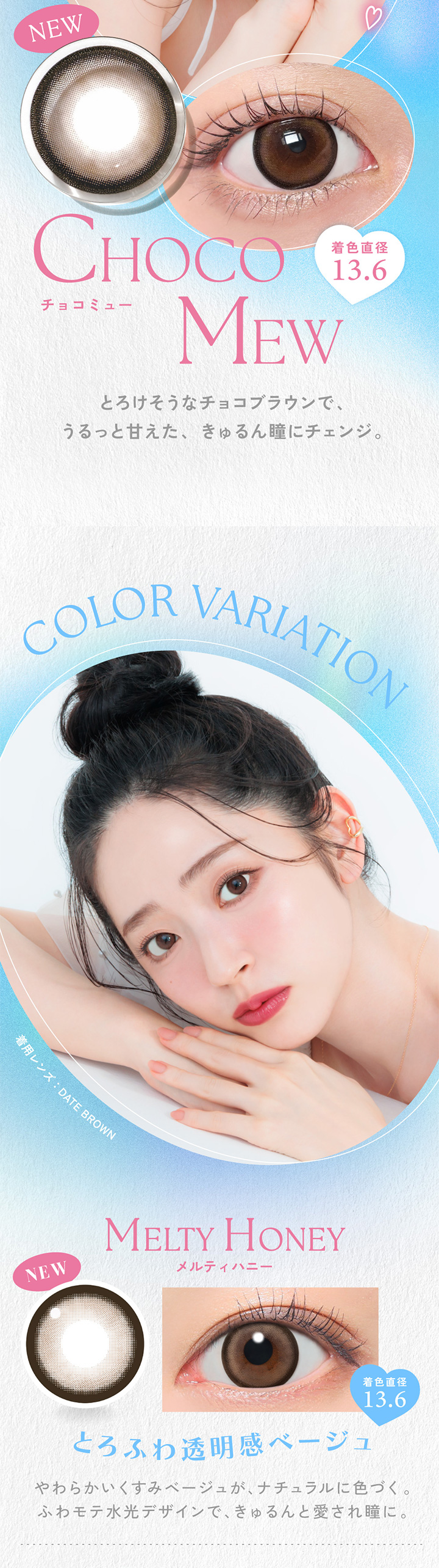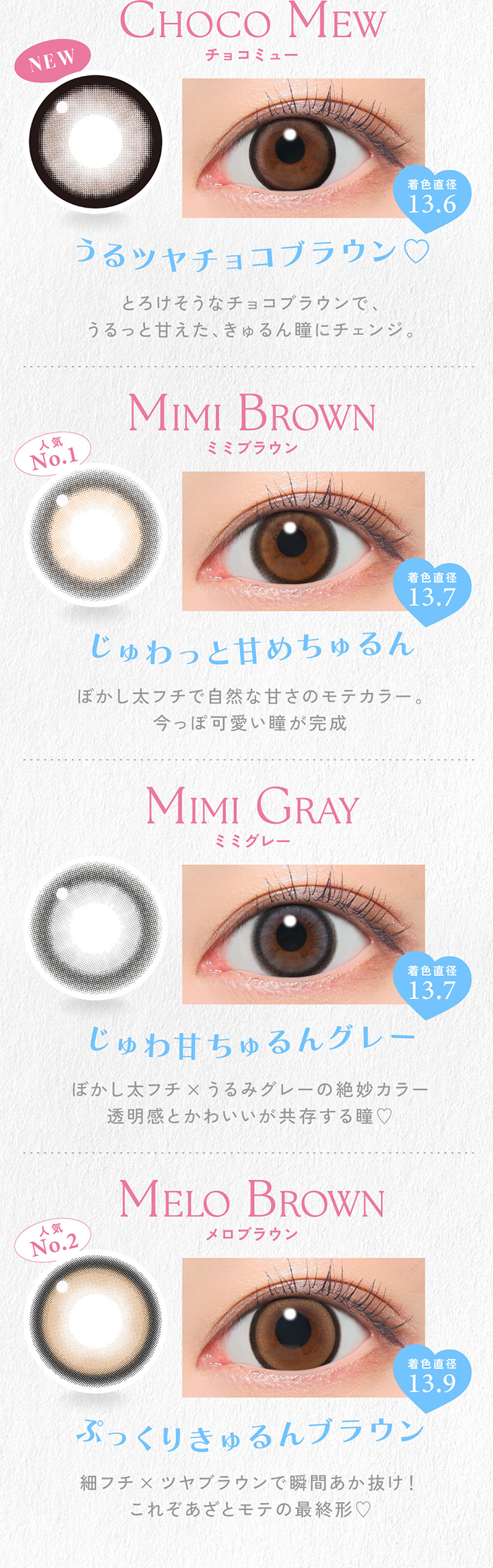 ■カラー:キングブラウン、ナチュラルブラウン、ゴシップブラウン、ビギナーチョコレート、ビギナーブラック、シュガーブラウン、リリーヘーゼル、グラスブラウン、マリアージュモカ、ピュアエトワール、アリアナヘーゼル、シェリーグレージュ、ミミブラウン、デートブラウン、ルルブラウン、ネネヘーゼル、メログレー、ミミグレー、メロブラウン、メルティハニー、チョコミュー