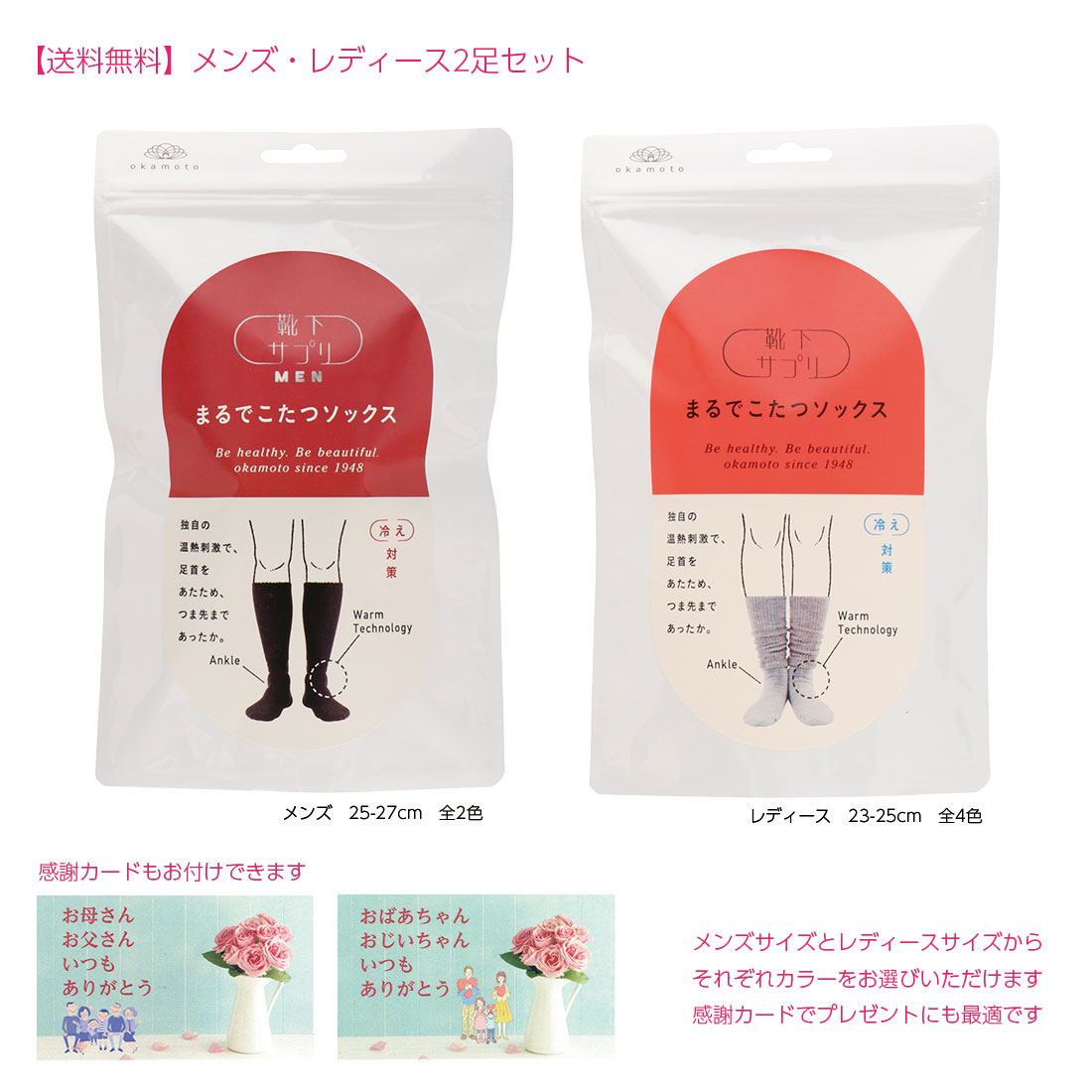 (ご両親へのプレゼントに) まるでこたつソックス メンズ・レディース2足セット 感謝カード 岡本株式会社 靴下サプリ