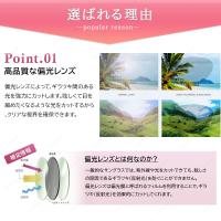 偏光は、物体から反射された光で、ぎらついた光のことです。当製品のレンズにはこの偏光をカットするレンズを採用しています。眩しいぎらついた光を防ぎ、クリアな視界を提供します。