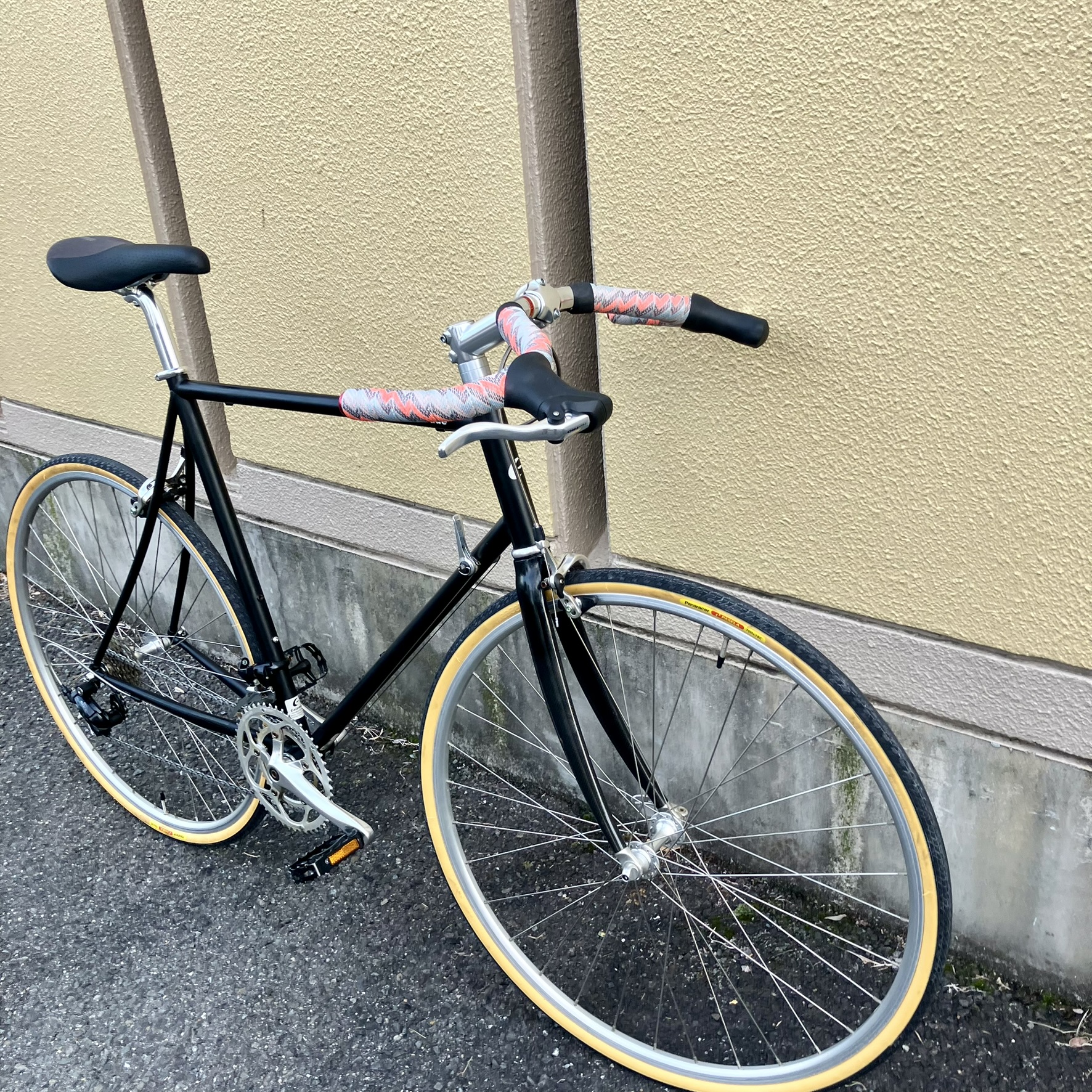 ハンドルはドロップよりかはのんびりと、ブレーキもしやすく、かつドロップな雰囲気はギリギリ保っていて良いハンドルです。