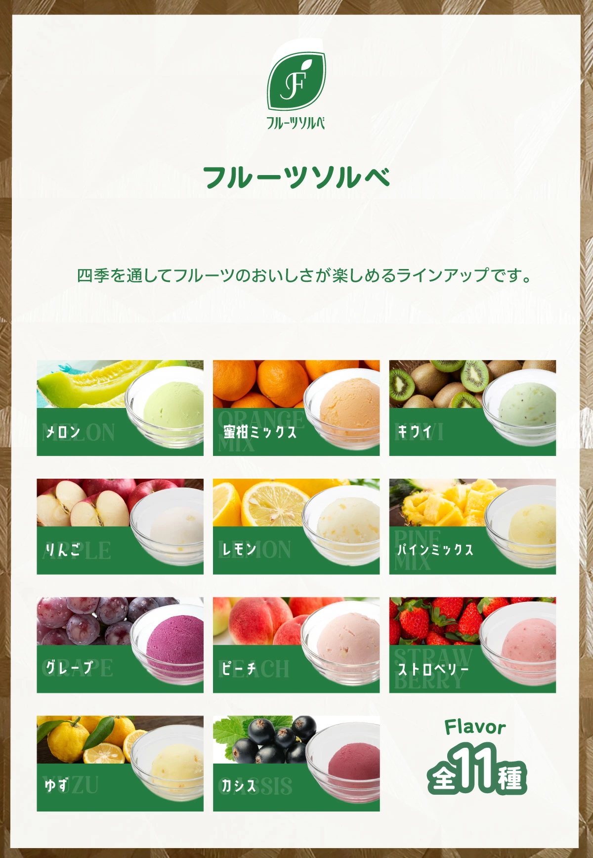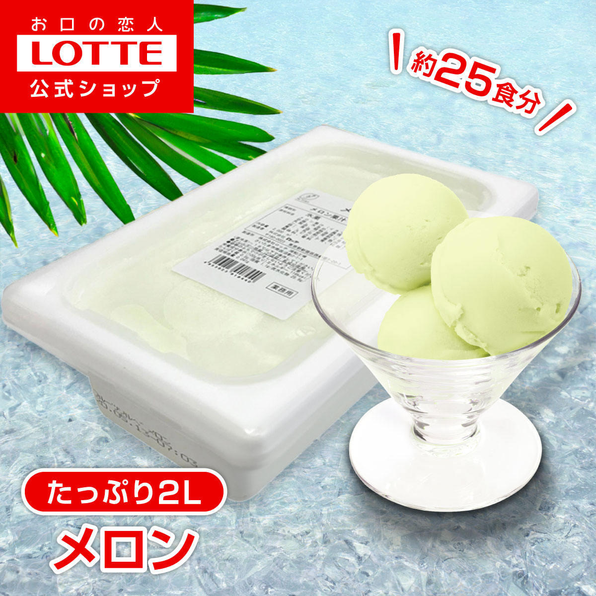 メロン果汁(イタリア製造)、砂糖、水あめ、異性化液糖、乳製品、植物油脂、デキストリン、食塩/安定剤(増粘多糖類)、乳化剤、着色料(紅花黄、スピルリナ青、紅麹)、酸味料、香料