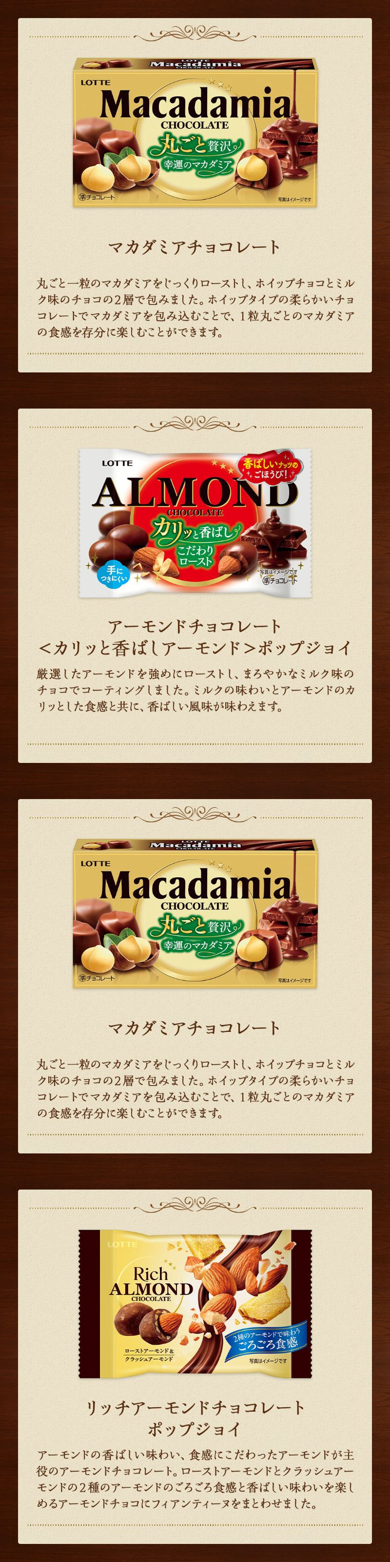 砂糖(国内製造)、ローストマカダミアナッツ、全粉乳、カカオマス、植物油脂、ココアバター、乳糖、クリーム加工品/乳化剤、香料、(一部に乳成分・アーモンド・大豆を含む)
