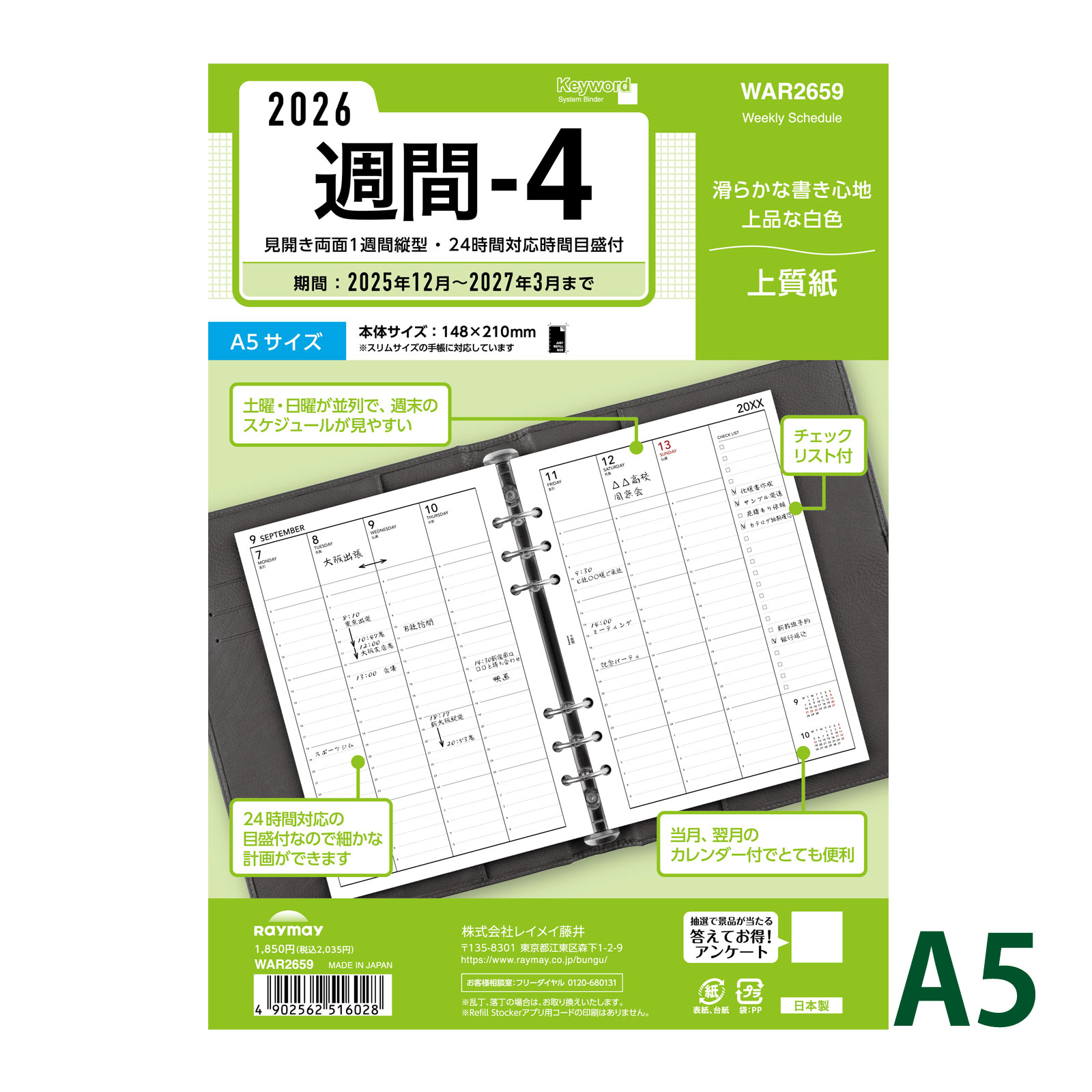 レイメイ藤井 手帳 2026年 1月始まり システム手帳用 リフィル キーワード 週間4 A5サイズ A5 ウィークリー スケジュール帳 ビジネス手帳