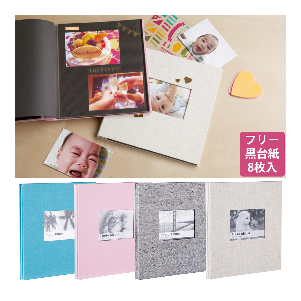 布貼り表紙と落ち着いたカラーがインテリアにもなじむ、フレーム付ミニフリーアルバム表紙に好きな写真を入れて飾れる、フレームポケット付。写真や雑誌の切り抜き、チケットなども一緒にレイアウトできるフリー台紙(黒)。台紙が増やせるビス式タイプ。最大約20枚まで追加可能。(専用台紙:XP-10F)1ページにLサイズ、ポストカード、ハイビジョンなら2枚、2Lサイズなら1枚の写真が貼れます。
