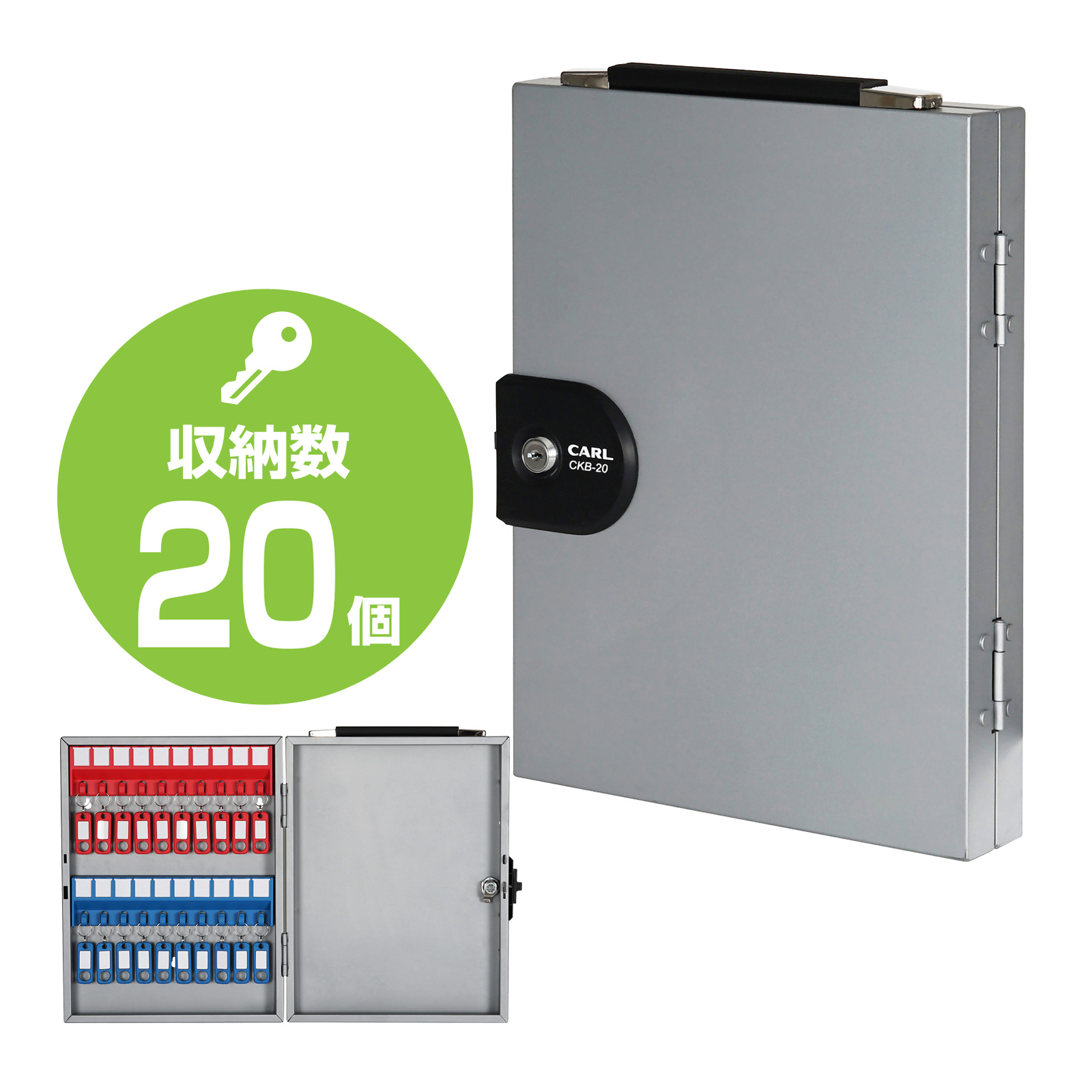 コンパクトサイズで多くの鍵を収納でき、簡単に壁掛けができる錠前式のキーボックスです。オフィスのセキュリティを管理する、スチール製キーボックス。カラー識別で見やすいキーハンガー。鍵収納数20個強固なスチール製錠付き壁掛け用穴付きキーハンガー(赤青×各1個)入キーホルダー(赤青×各10個)入鍵付き(開錠用キー×2個入)ハンドル付ネジ×3本(φ3.5×24mm)