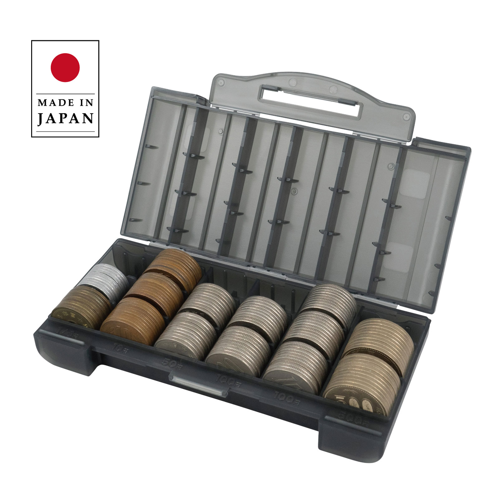 ■硬貨収納枚数:500円(25枚)、100円(60枚)、50円・10円(30枚)、5円/1円(共通スペースで計30枚)