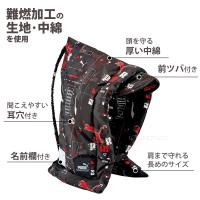 難燃加工の生地・中綿を使用。危険物や衝撃から頭を守る厚い中綿入。サイズ:H420×W290×D80mm