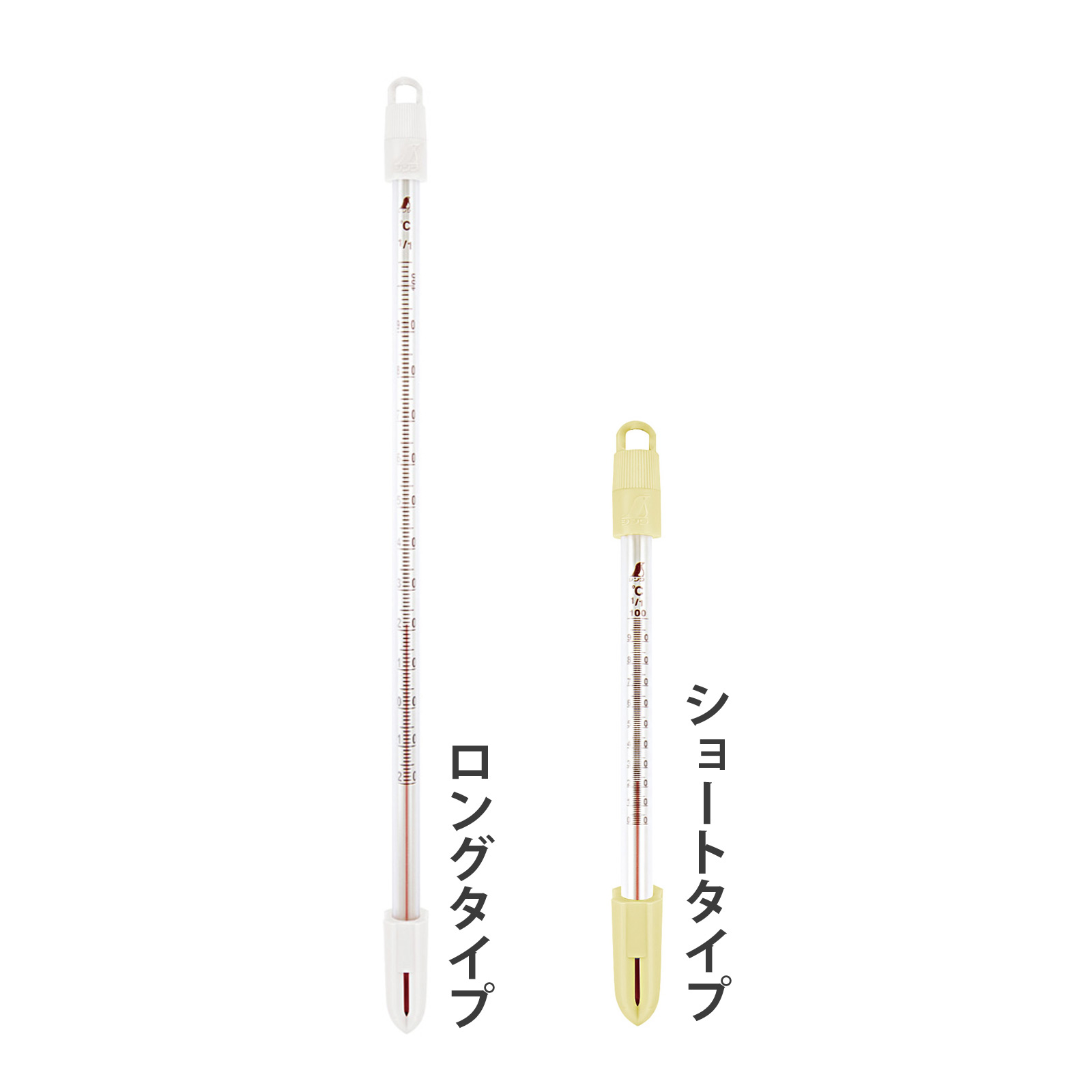 ケース付き棒温度計。本体サイズ:ロング/縦300×横6×高さ6mm、ショート/縦153×横6×高さ6mm