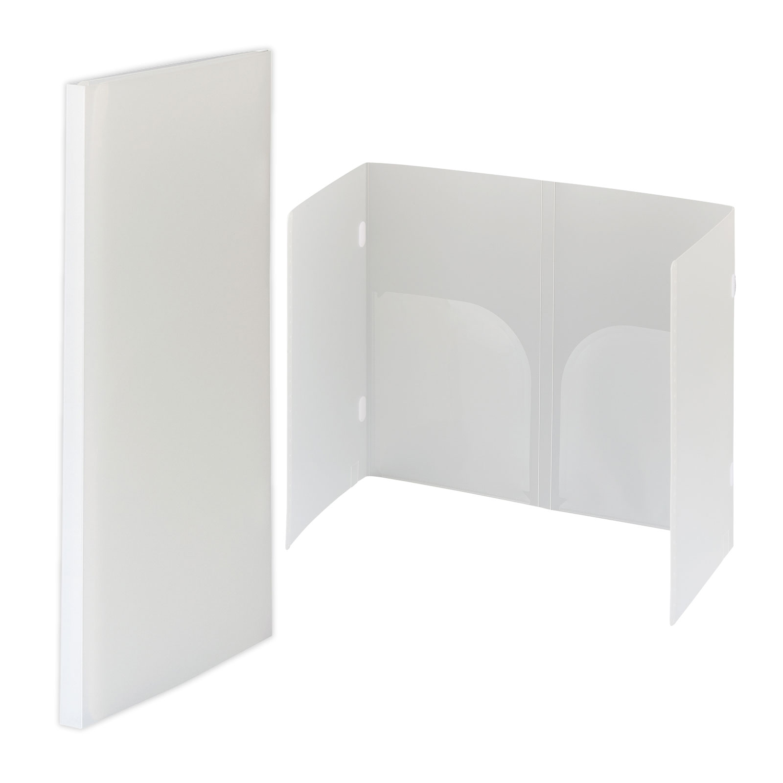 光を遮らない乳白色のブースで手元が明るく作業しやすい。安心の高さで飛沫感染防止。正面には書類が入るポケット付き。消毒して衛生的に使える厚手のポリプロピレン製。