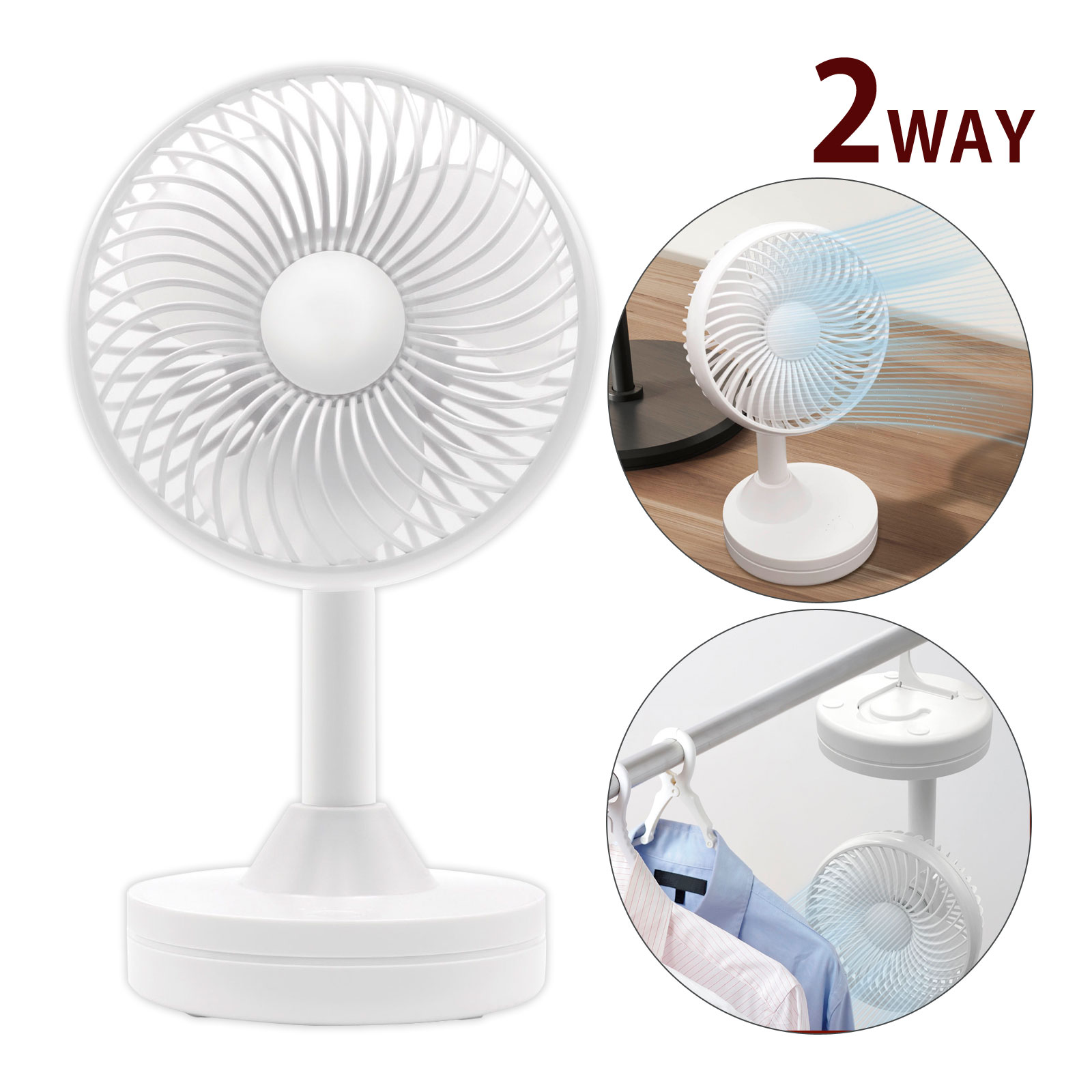 2WAYで使える便利な自動首振りデスクファンです。首振り機能で広範囲に風を行き渡らせ、身体の冷えすぎを防ぎます。USB充電式で設置場所を選ばないコードレスタイプで、デスク周りや熱気がこもりがちなキッチンを涼しく快適にします。底面のフックで物干し竿にかけて部屋干しのお手伝いにも。