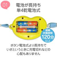92dBの大音量です。防水機能付きです(防水IPX5適合)。面ファスナー付取付ベルト・安全ネックストラップ・名前シール・単4乾電池2本が付いています。ネックストラップは強く引っ張ると外れる安全キャップ付きです。取付用 平ゴムでランドセルの肩掛け紐に取付できます。ライトとブザーのボタンが反射ボタンのため夜間も安心です。ボタンを押すとライトが点灯します。ピンが抜けないのでなくしません。電池が長持ち乾電池仕様です。