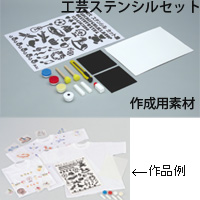 ハンカチやTシャツなどに!インクは混色が可能です。※Tシャツは別売です。セット内容:インク(赤、青、黄、白、黒)×各1、型紙シール×1、スポンジタンポ×2、スポンジ×2、カーボン紙×2、実物大カット集×1、工作専用カッターナイフ×1